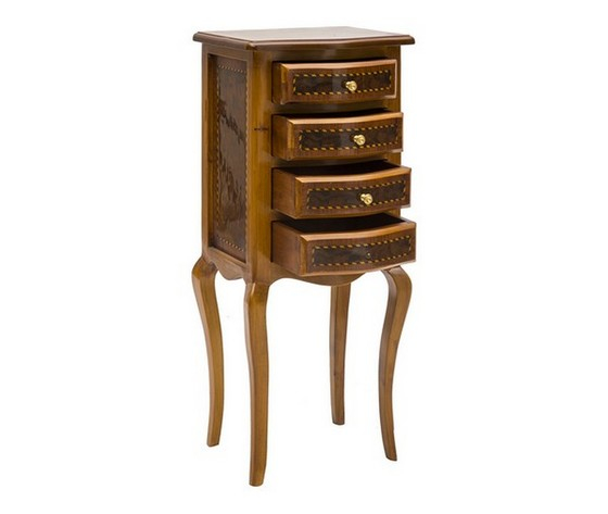 Elegante comodino barocco con 4 cassetti, intarsiato, color noce.
