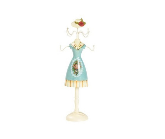 Bustino, manichino portagioielli collane, anelli bracciali, orecchini, portagioie con vestito azzurro, disegno a fiori e cappello.