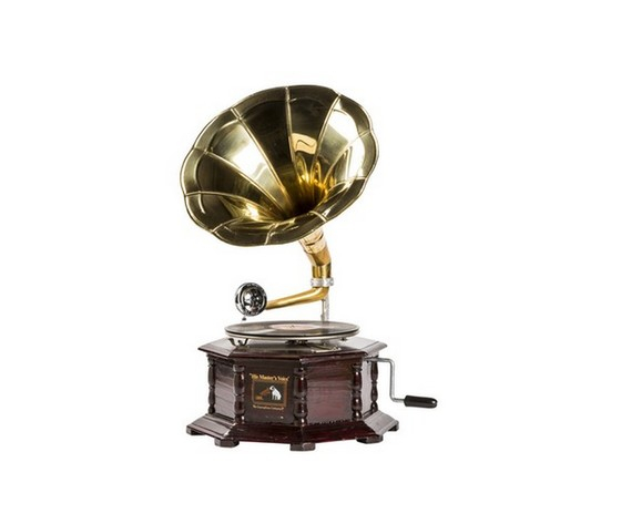 Grammofono vintage con cassa esagonale in legno marrone scuro e tromba in ottone lucido.
