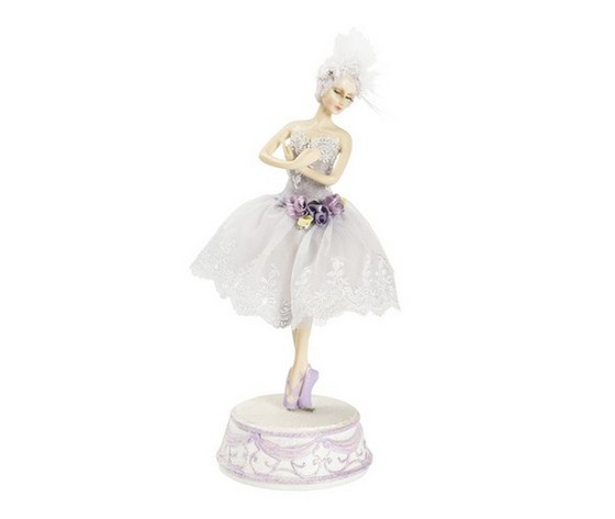 Carillon in resina a carica musicale, con ballerina di danza classica con tutù viola e lilla.