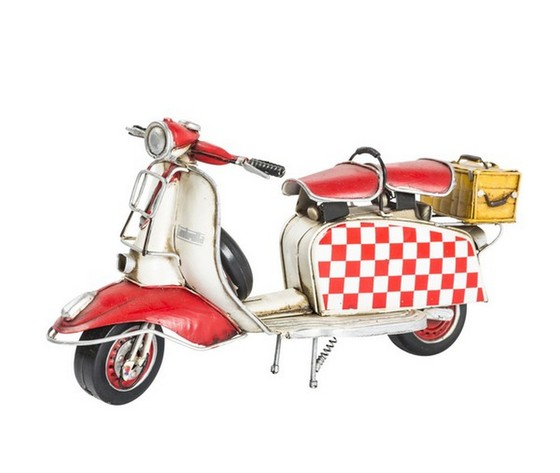 Modellino di vespa bianca e rossa con portapacchi.