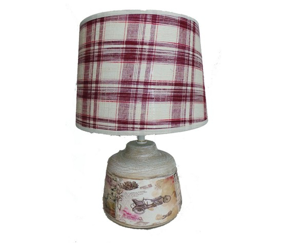 Lampada da tavolo con stampa vintage e paralume a quadretti bianchi rossi.