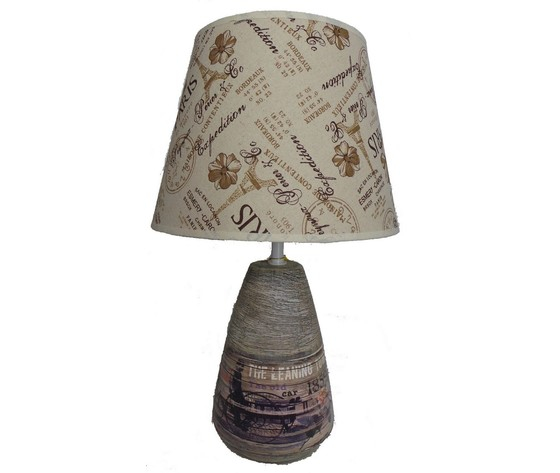 Lampada da tavolo con stampa vintage e paralume avorio.