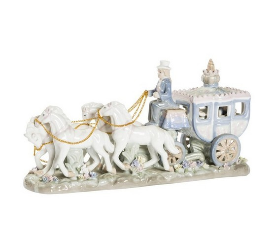 Carrozza in porcellana con cocchiere e cavalli. In colori tenui.