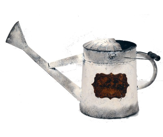 Annaffiatoio, innaffiatoio per piante e fiori da giardino. In ferro di colore bianco anticato e marrone con scritte e decorazioni di fiori. Stile Vintage.