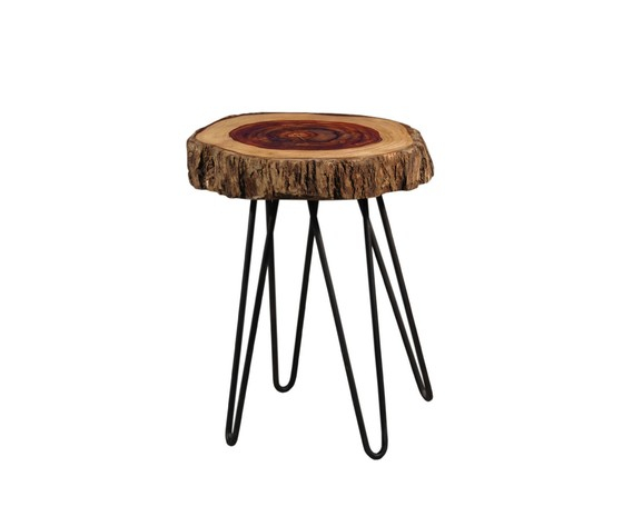 Tavolino, sgabello in legno con top a tronco d'albero e piedi ferro.