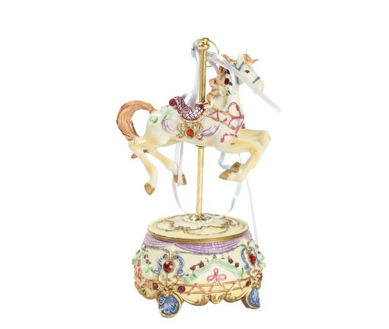 Carillon, carosello, giostra girevole musicale con cavallo in resina e nastrini in tessuto, in colori chiari.