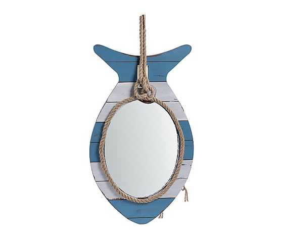 Specchio in legno di colore bianco e azzurro a forma di pesce con led e corda. Stile casa al mare, nautico.