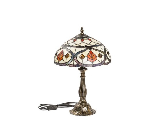 Lampada Tiffany da tavolo con base in ottone e paralume con foglie.