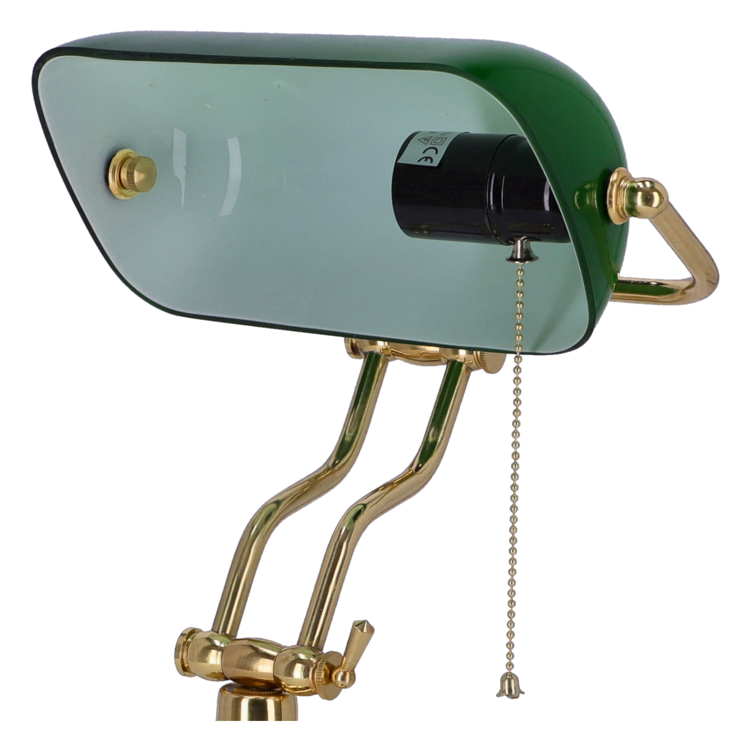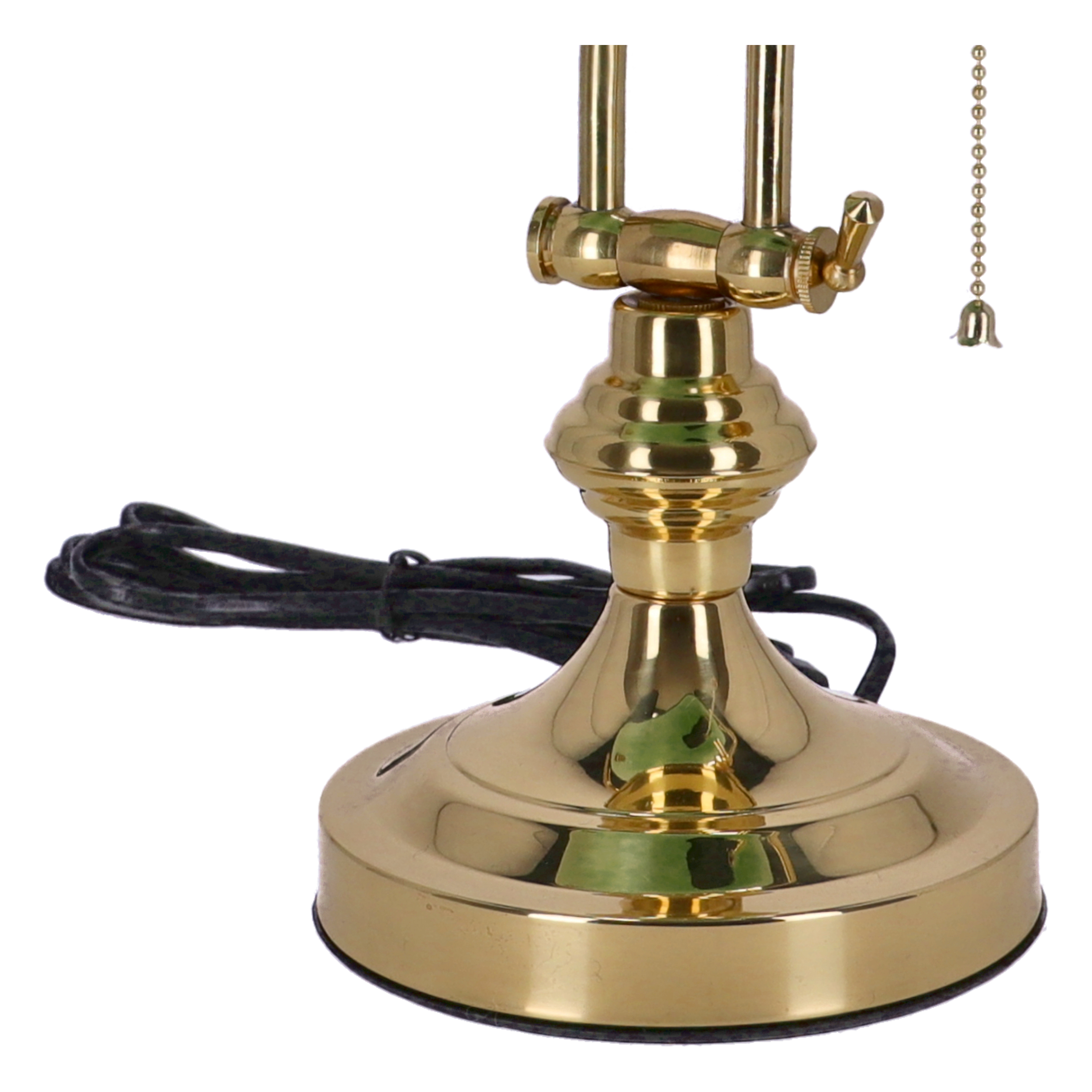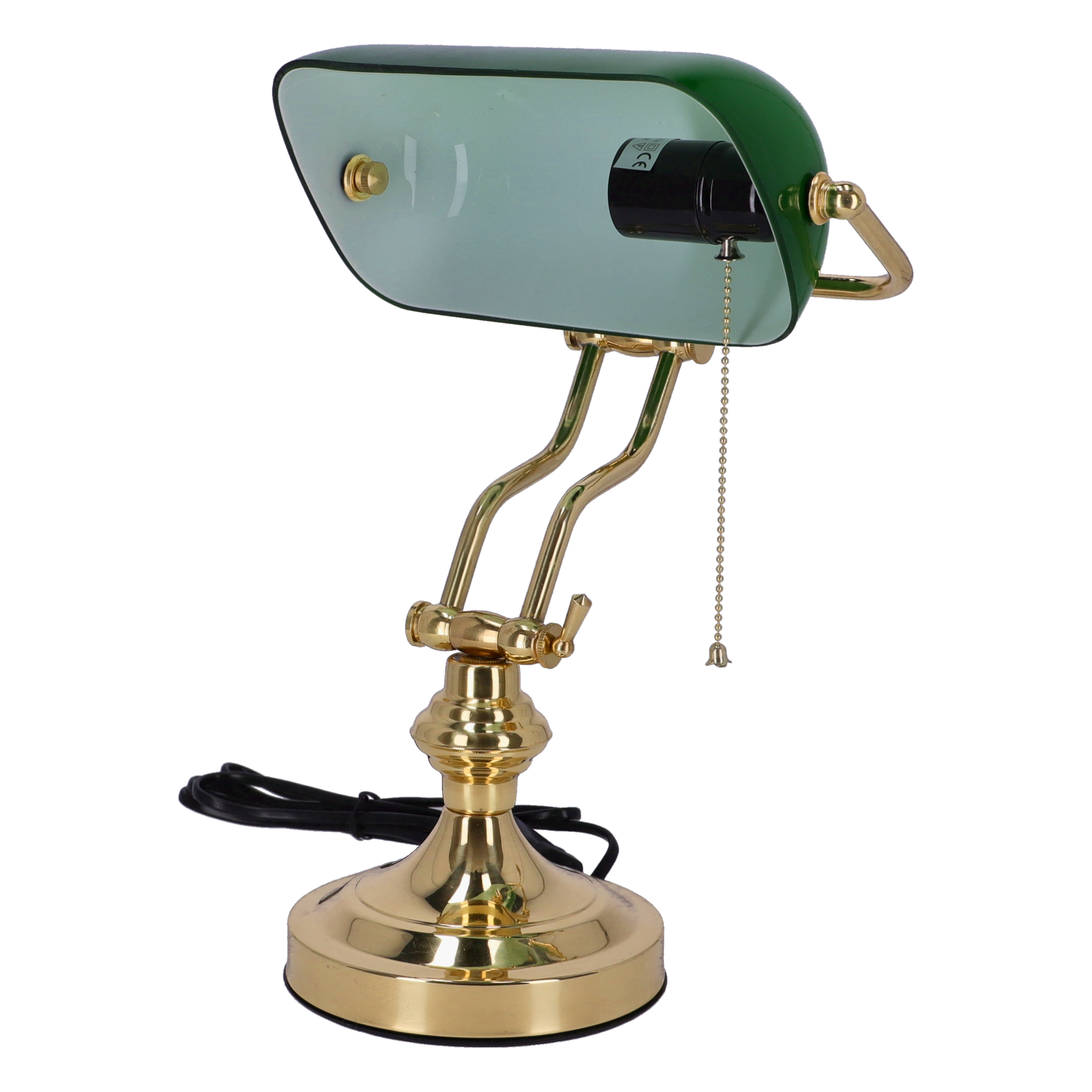 Lampada da scrivania ministeriale con telaio in ottone lucido snodato in 2 punti e paralume è in vetro verde. Attacco standard.
