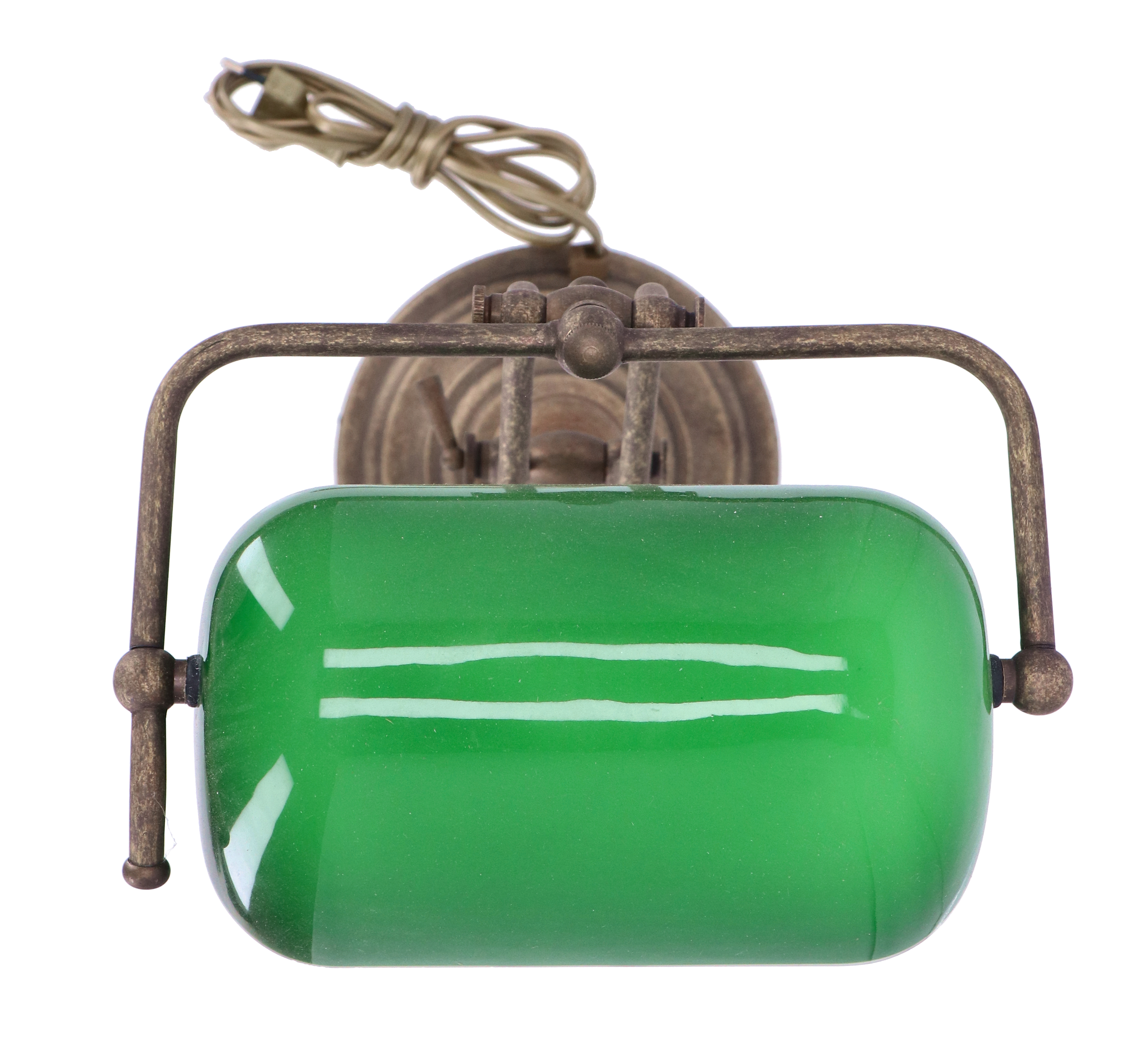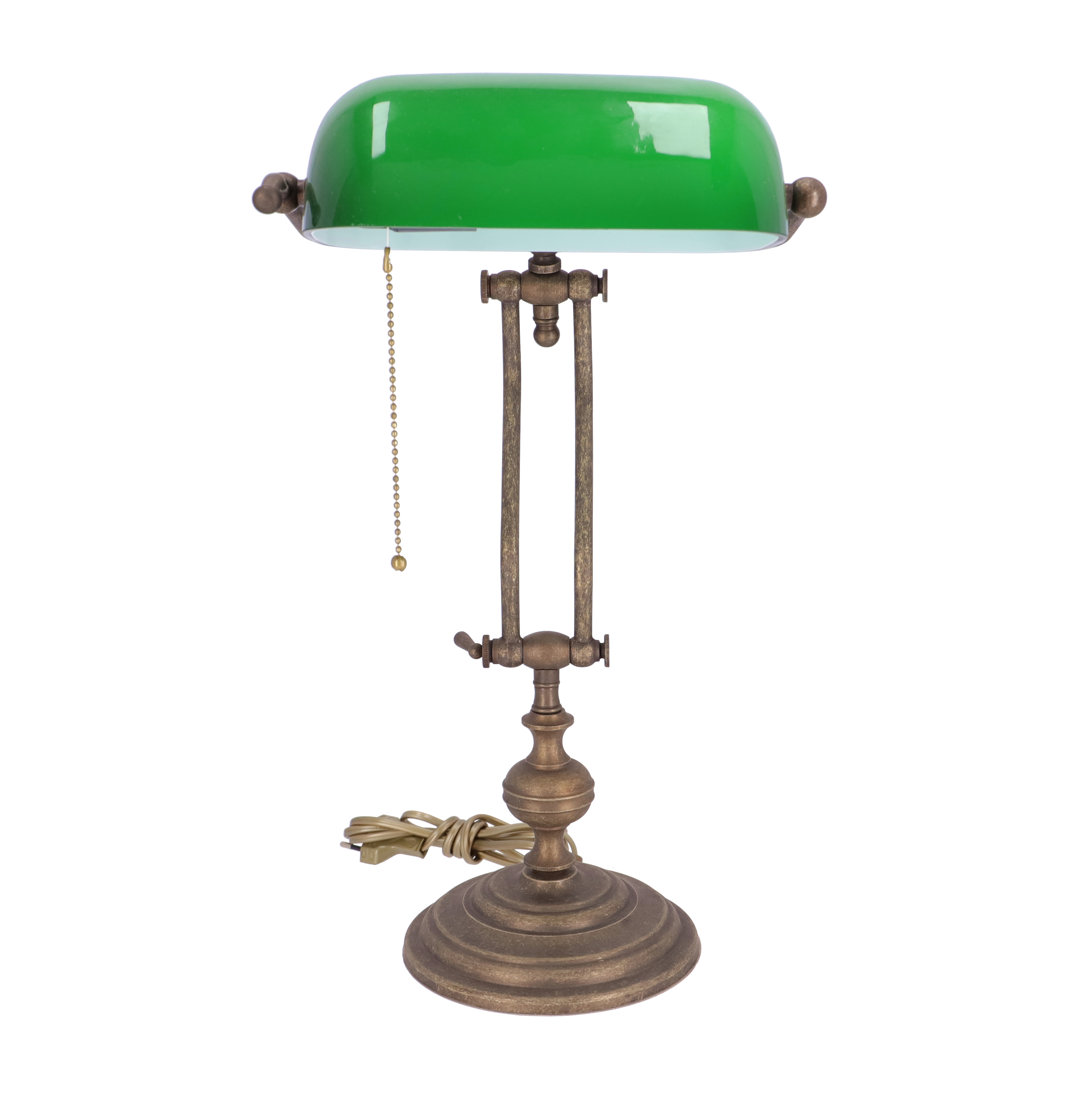 Lampada da scrivania ministeriale in ottone brunito con telaio snodato in 3 punti e paralume in vetro verde. Accensione con catenella. Attacco standard E27, potenza massima della lampadina 60watt.