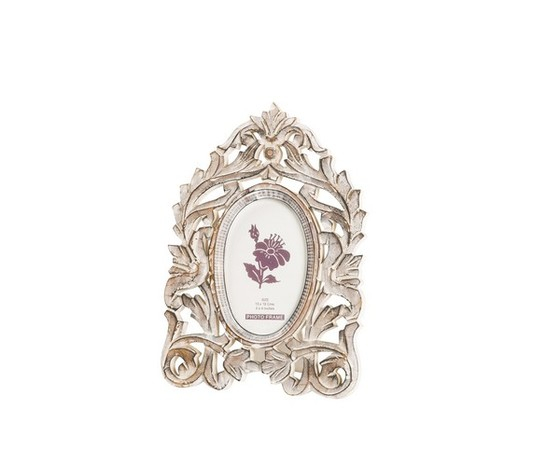 Portafoto in legno bianco anticato di forma ovale.