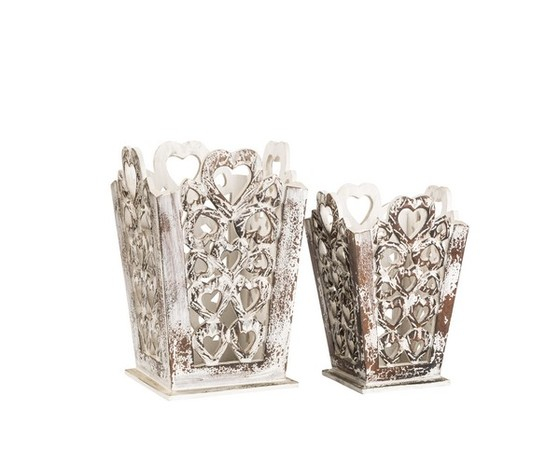 Set di 2 cestini contenitori in legno lavorato di colore bianco anticato.