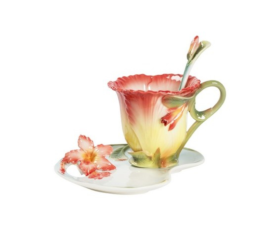 Tazzina in ceramica con piattino e cucchiaino rossa, gialla e bianca, decorata con fiori e foglie.