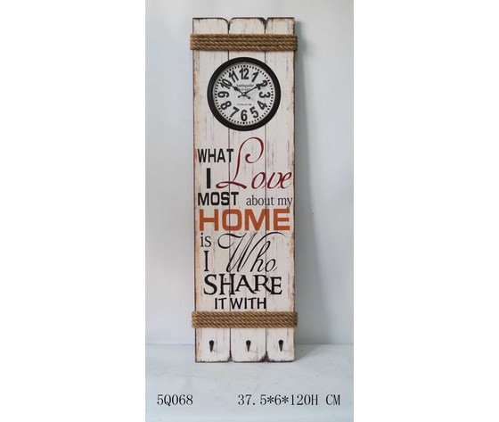 Orologio analogico a pannello in legno di colore bianco con numeri arabi con scritte.