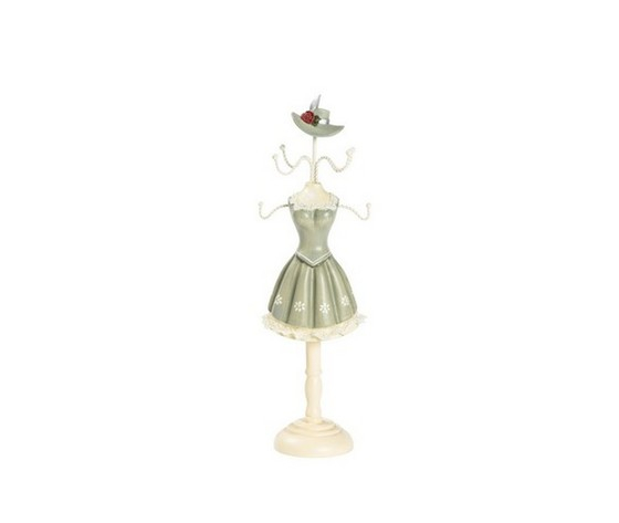 Bustino, manichino portagioielli collane, anelli bracciali, orecchini, portagioie con vestito verde con fiori e cappello.