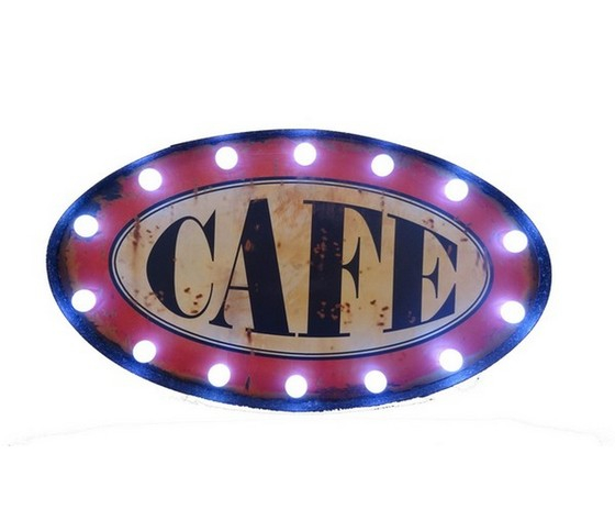 Insegna luminosa ovale, pannello con scritta 'CAFE' a led, di colore rosso in metallo.