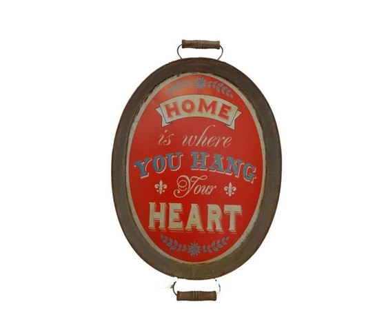 Vassoio ovale da cucina in metallo con manici in legno, di colore rosso con rifiniture marroni; con scritta decorativa.