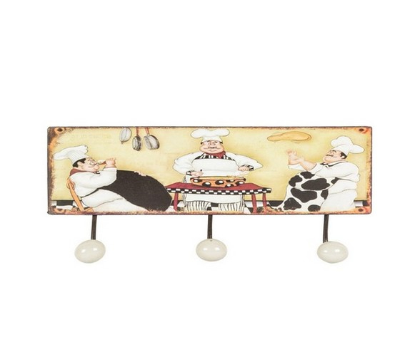 Appendino da cucina con tre ganci in metallo e pomelli bianchi, con stampa 'cucina chef'.