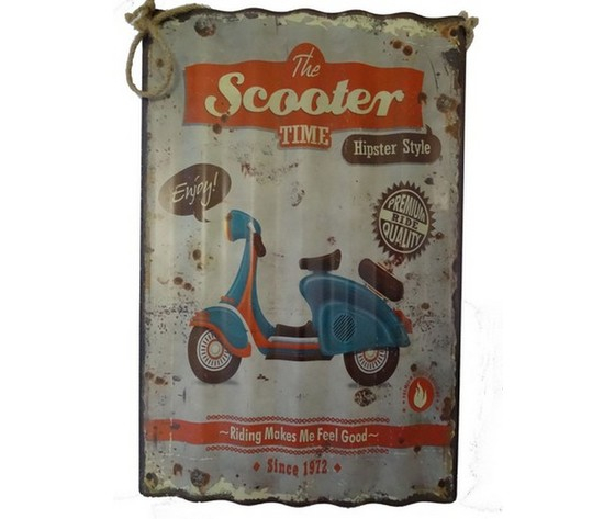 Pannello in metallo con vespa grigio azzurro rosso.