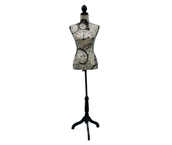 Busto porta abiti con stampa orologi, beige e nero.