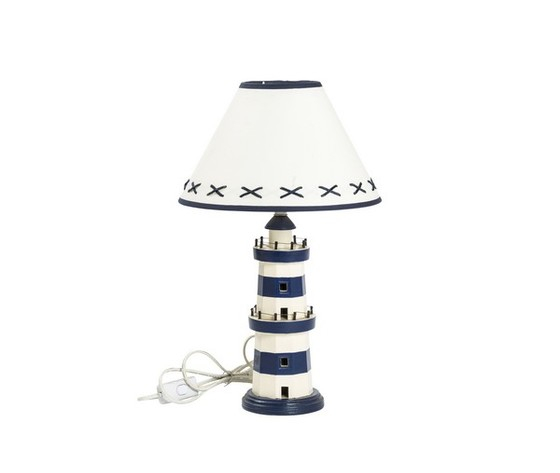 Lampada da tavolo con base a forma di faro di colore bianco e blu. Stile casa al mare.