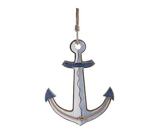 Ancora nautica in legno decorativa di colore celeste, bianco e blu da parete. Rifinita con corda, canapa.