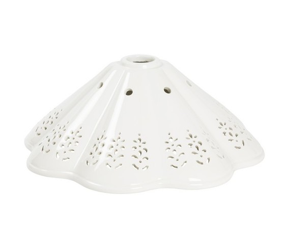 Piatto per lampadario, ricambio paralume, in ceramica traforato a forma di cono, di colore bianco.