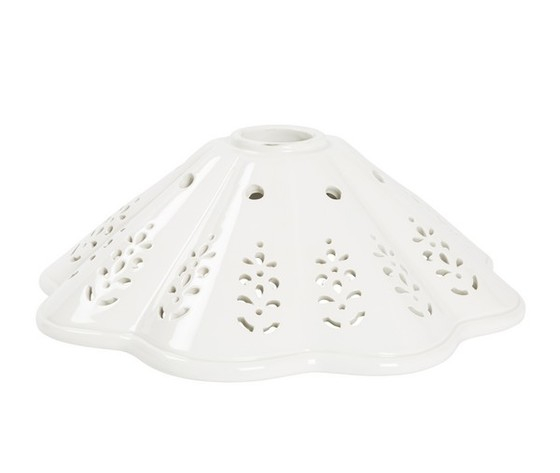 Piatto, ricambio paralume, in ceramica a forma di cono, traforato, di colore bianco.