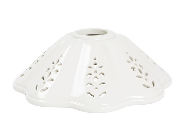 Piatto per lampadario, rocambio paralume in ceramica a forma di cono, traforato, di colore bianco.