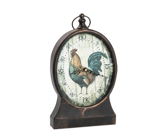 Orologio da appoggio con gallo e base anticata. Con attacco a parete. Stile vintage, country.