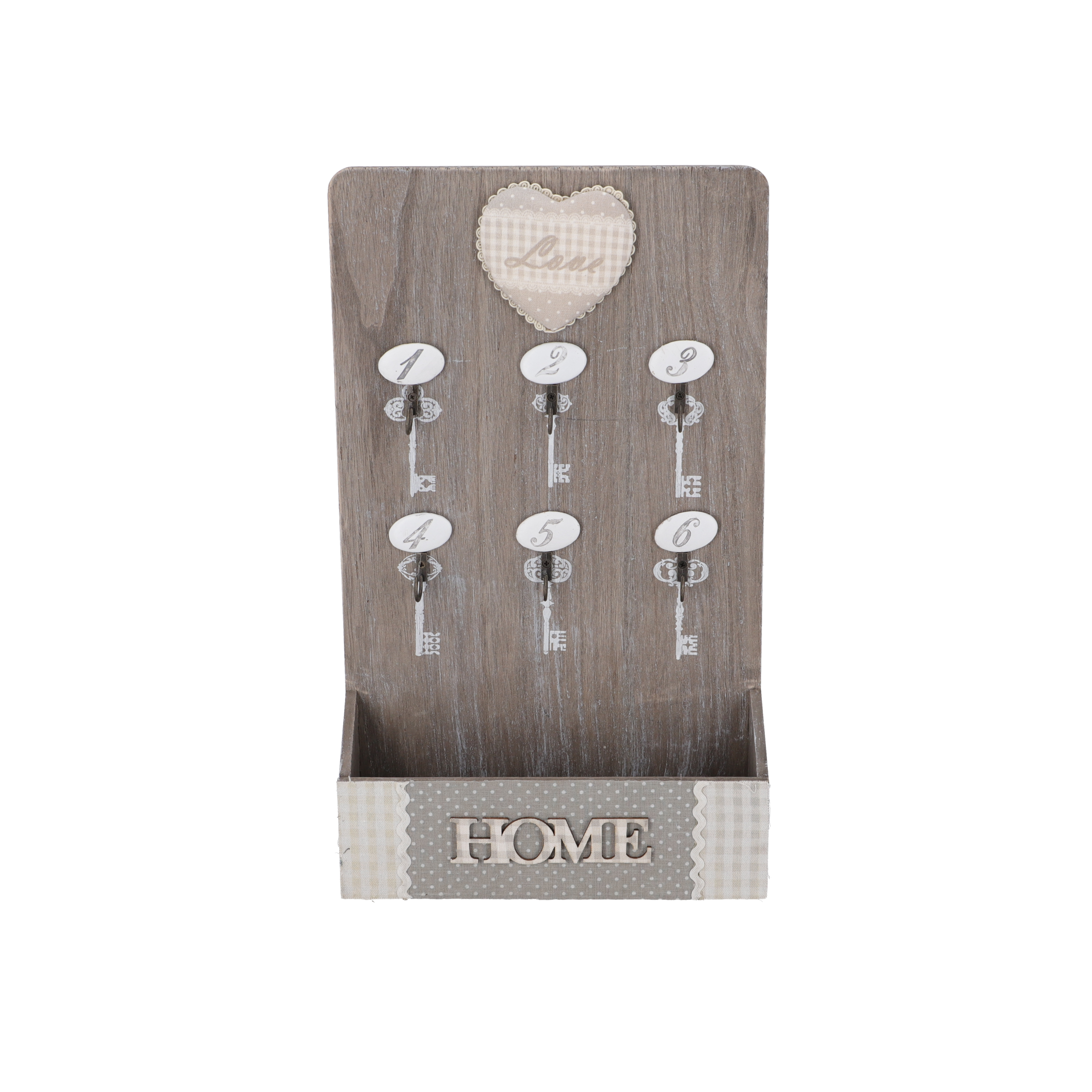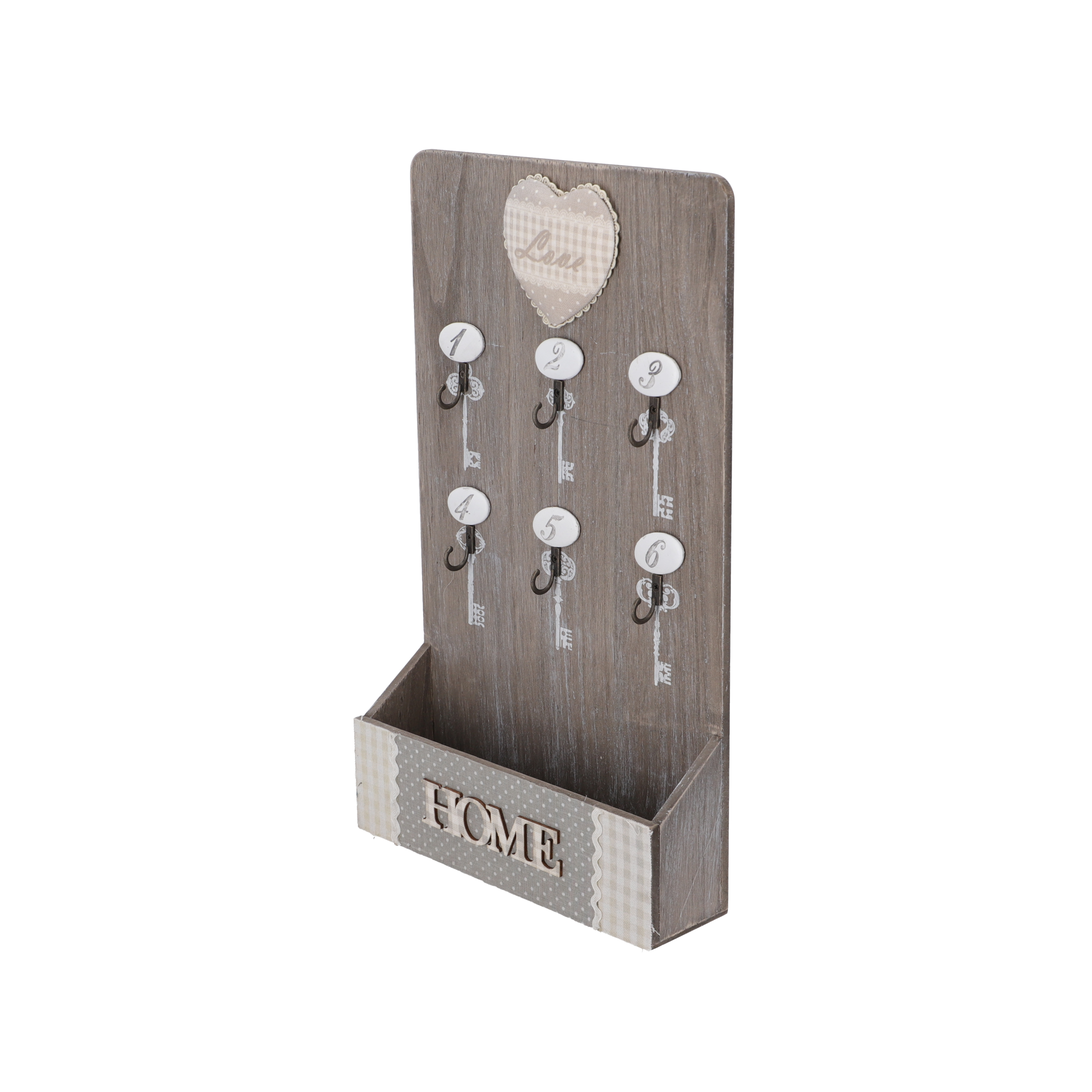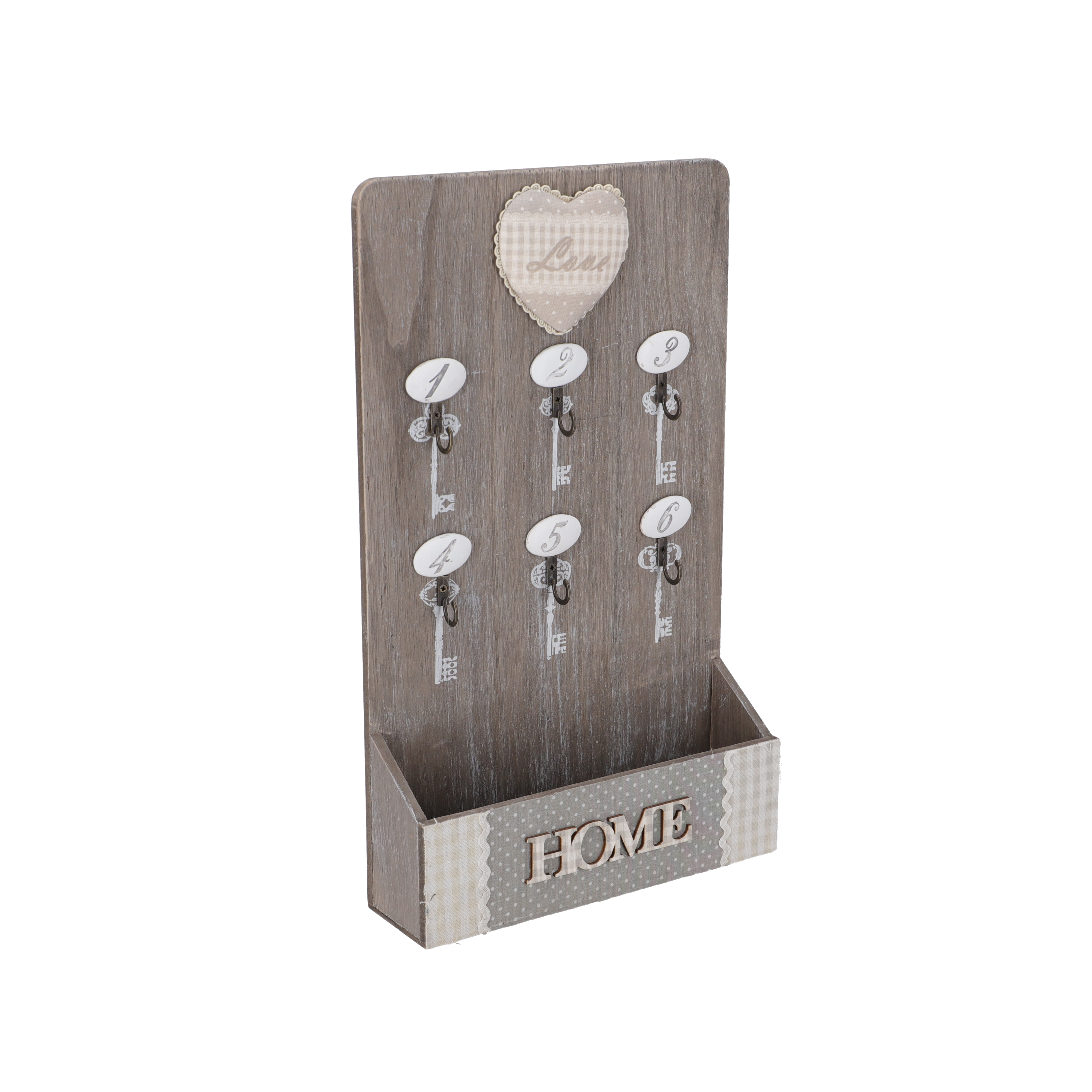 Portachiavi, appendi chiavi da parete, appendino in legno naturale e grigio a sei ganci in metallo e numeri in ceramica bianca. Stile Shabby Chic.