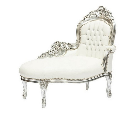 Dormeuse barocco, in ecopelle bianca, con schienale con gemme e struttura color argento.