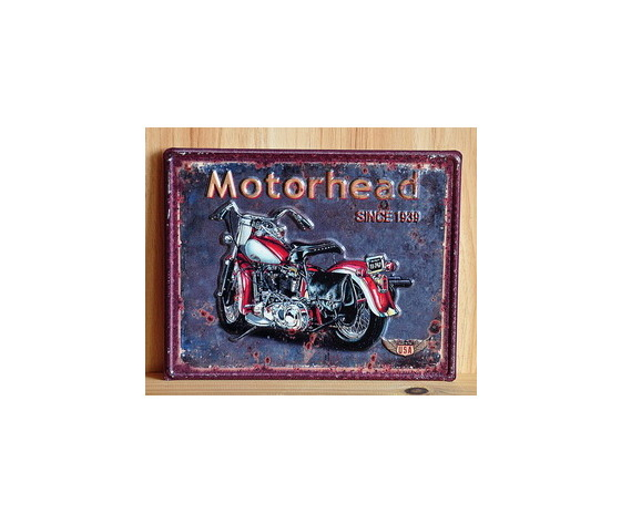 Targa, placca, pannello in metallo colorato e anticato, con scritta Motorhade da parete a forma rettagolare.