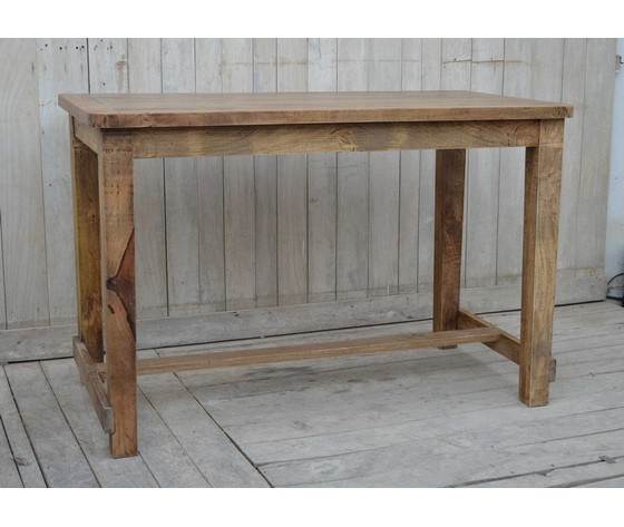Bancone, tavolo bar in legno naturale di forma rettangolare.