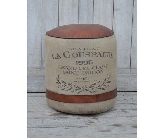 Pouf in pelle e tessuto imbottito di colore marrone e beige con scritte nere.