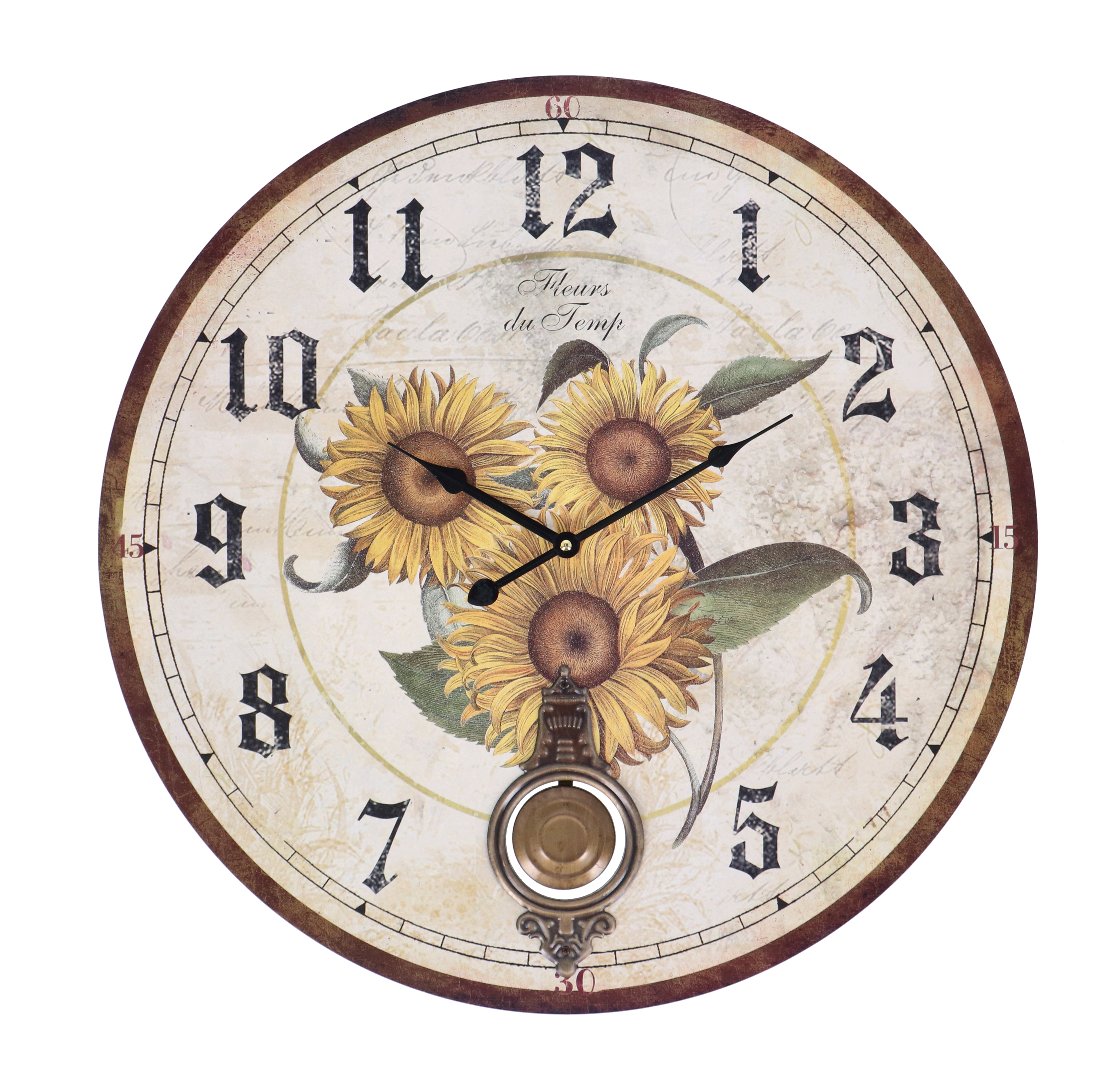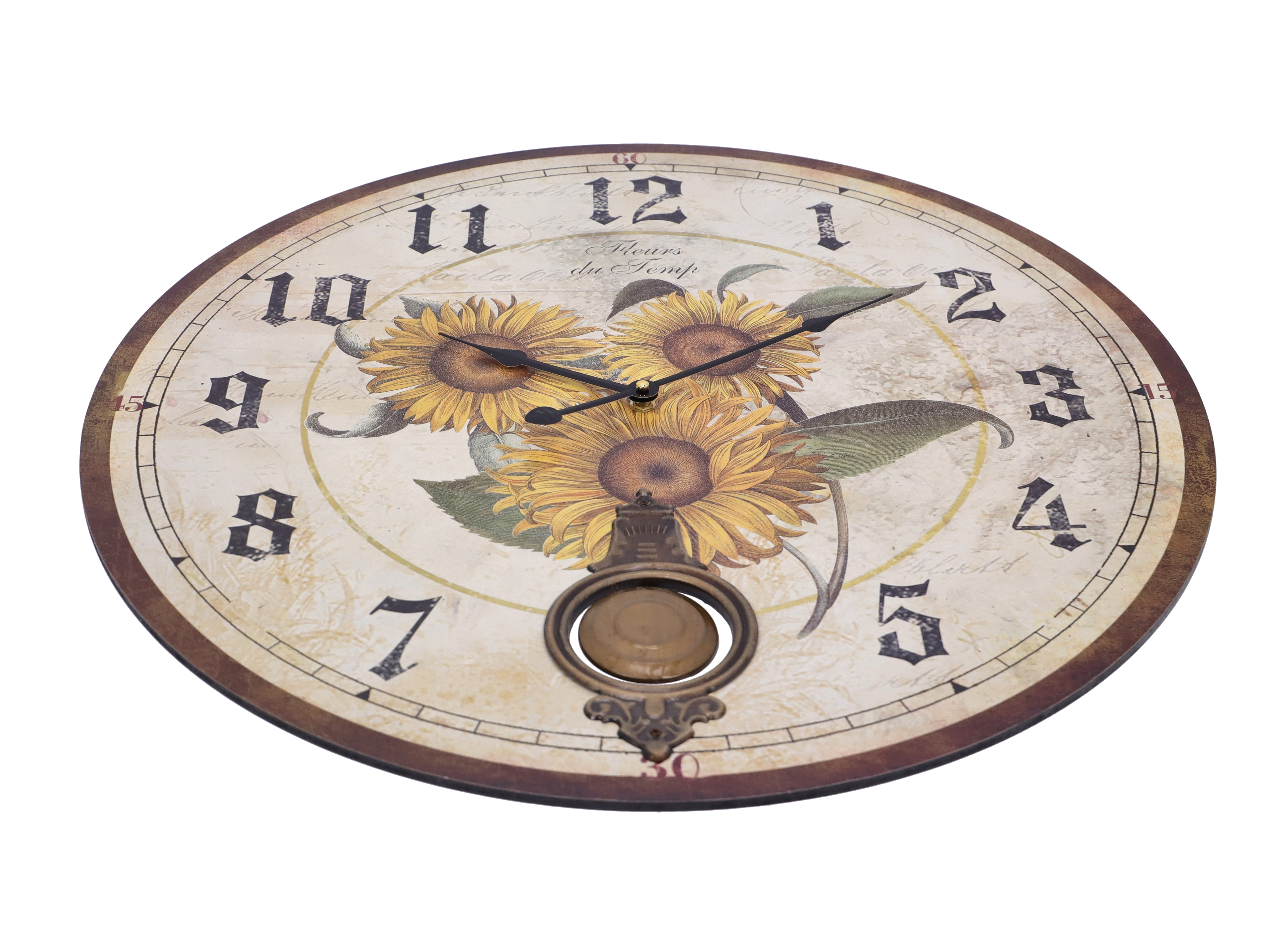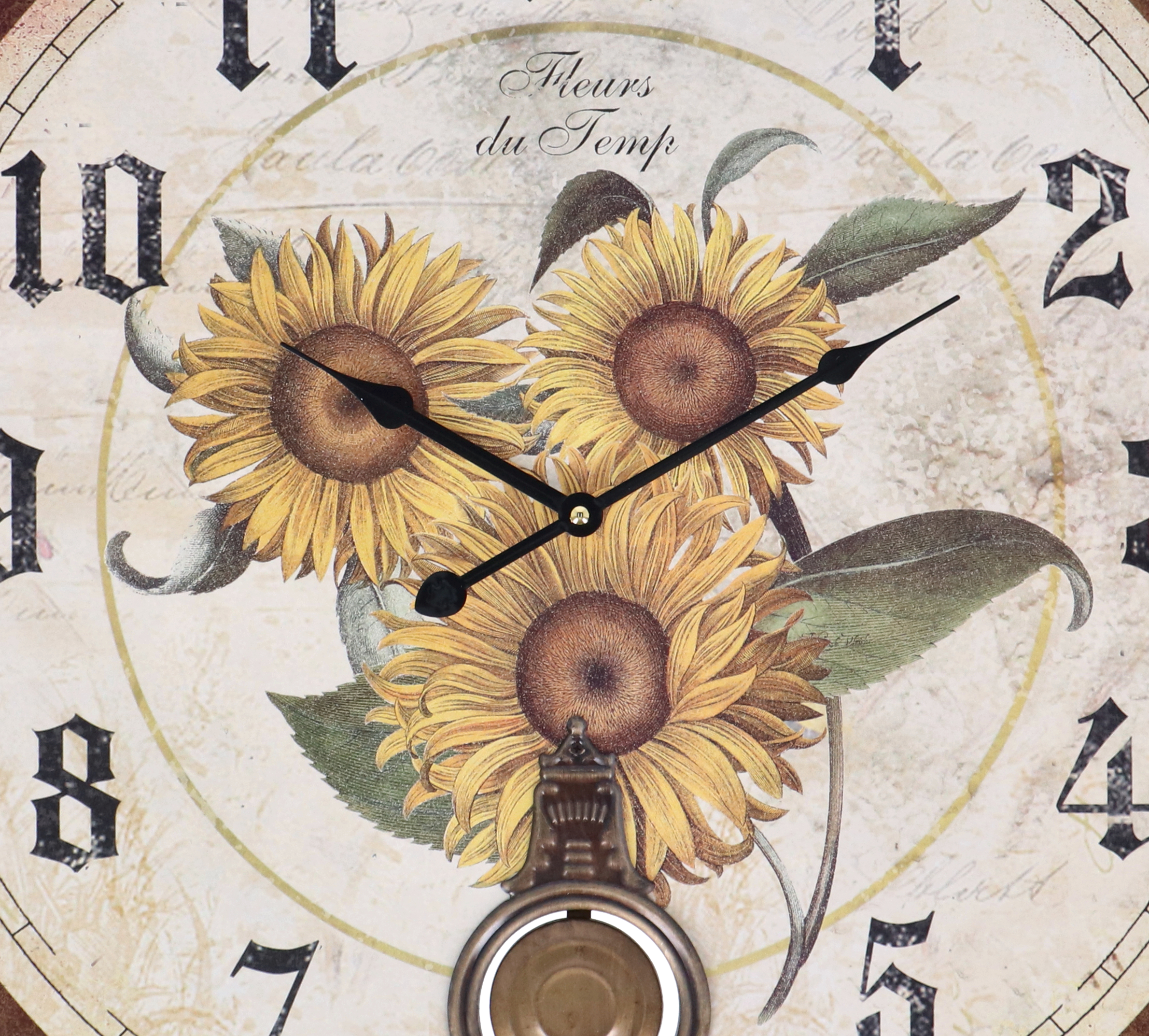 Il quadrante poi, di un colore beige, presenta una stampa di una fantasia floreale di girasoli e si completa con un pendolo dal gusto retrò al centro.