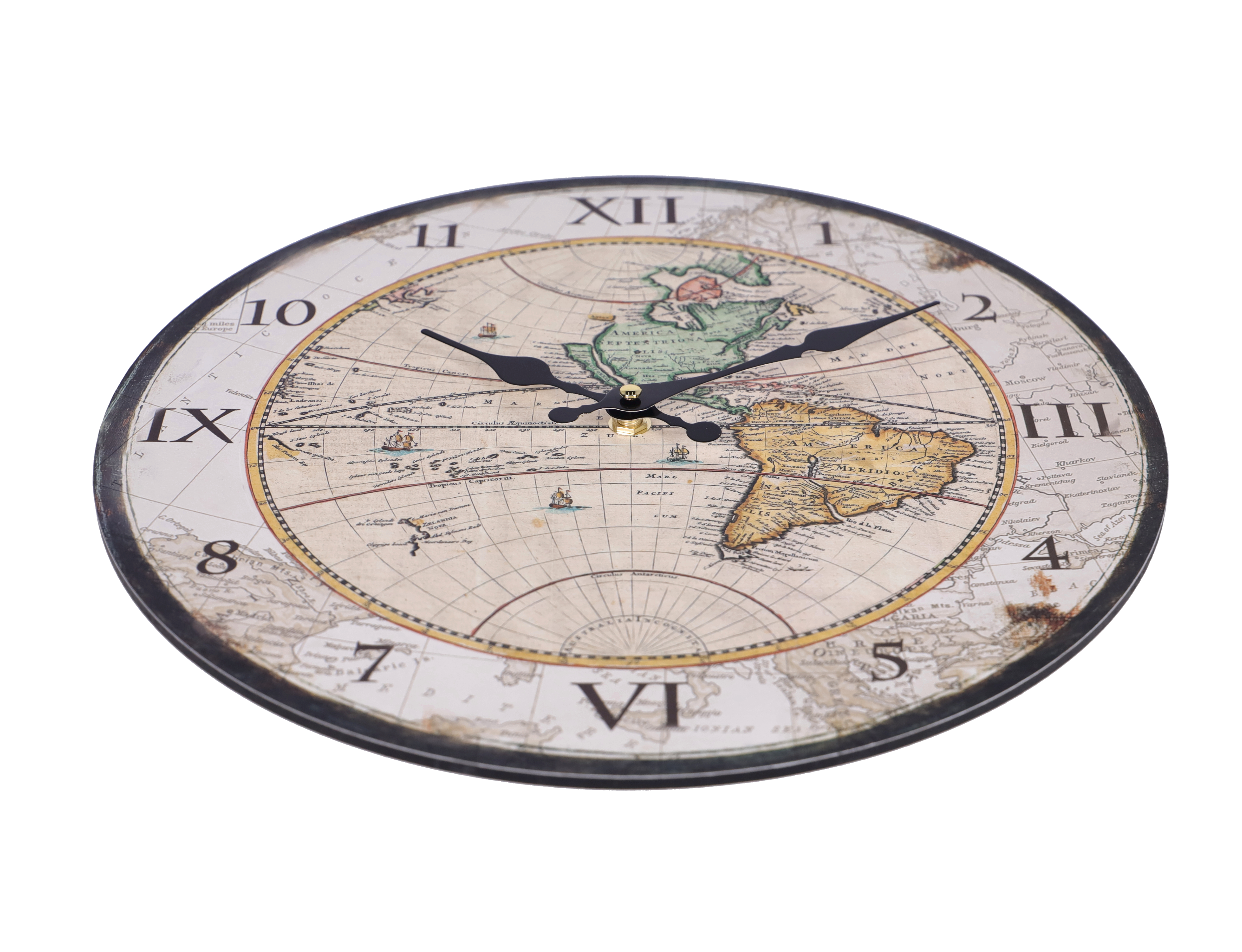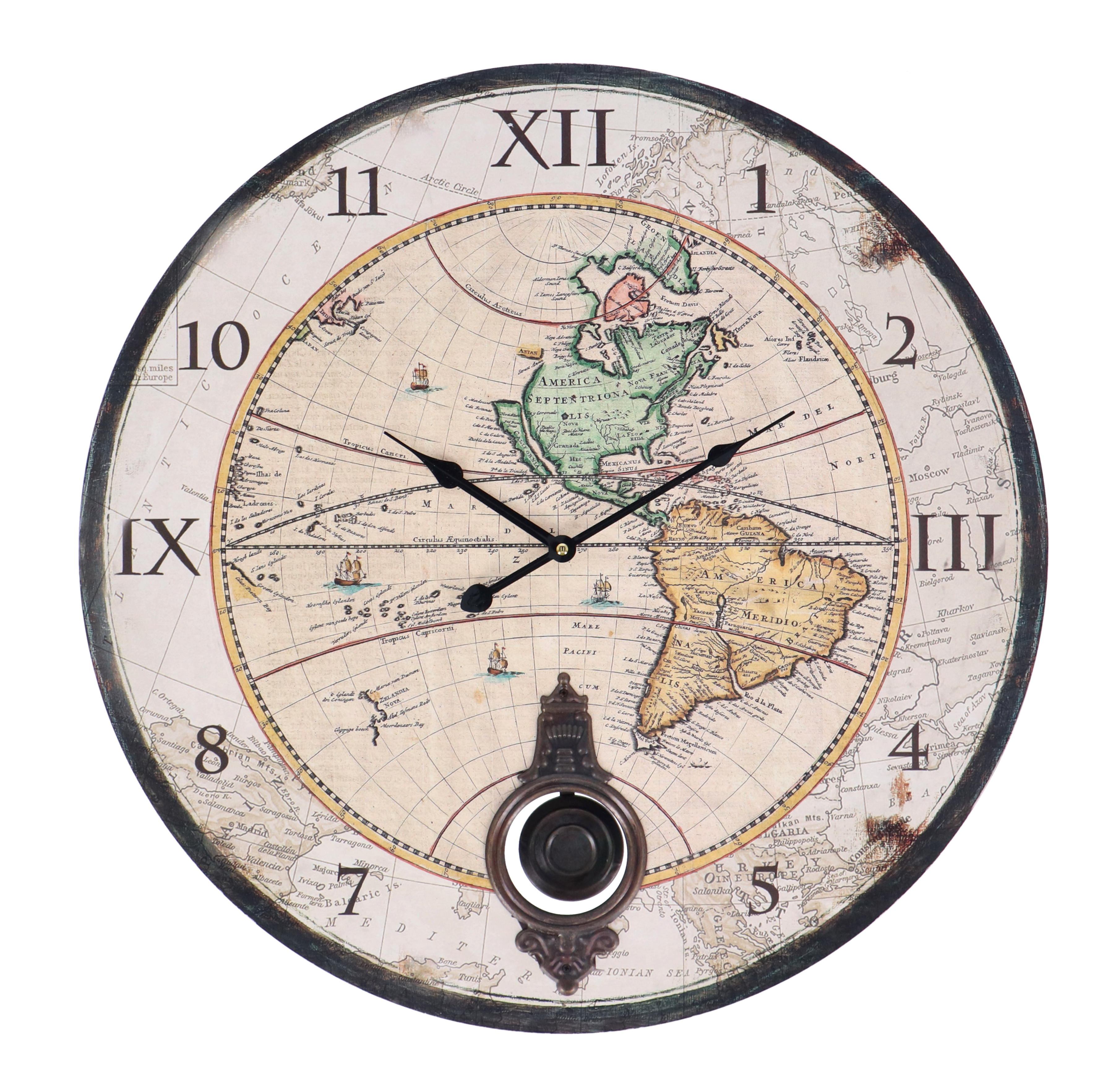 Il quadrante poi, di un colore beige con effetto legno anticato, presenta le ore in cifre miste romane ed arabe e al centro la stampa una stampa di un antico mappamondo. Si completa con un pendolo dal gusto retrò al centro.