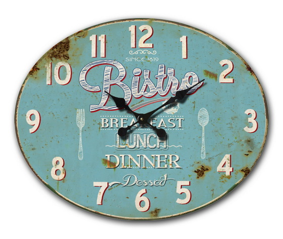 Questo orologio è da appendere alla parete e presenta un quadrante ovale in colore celeste, con effetto volutamente vintage nel metallo.