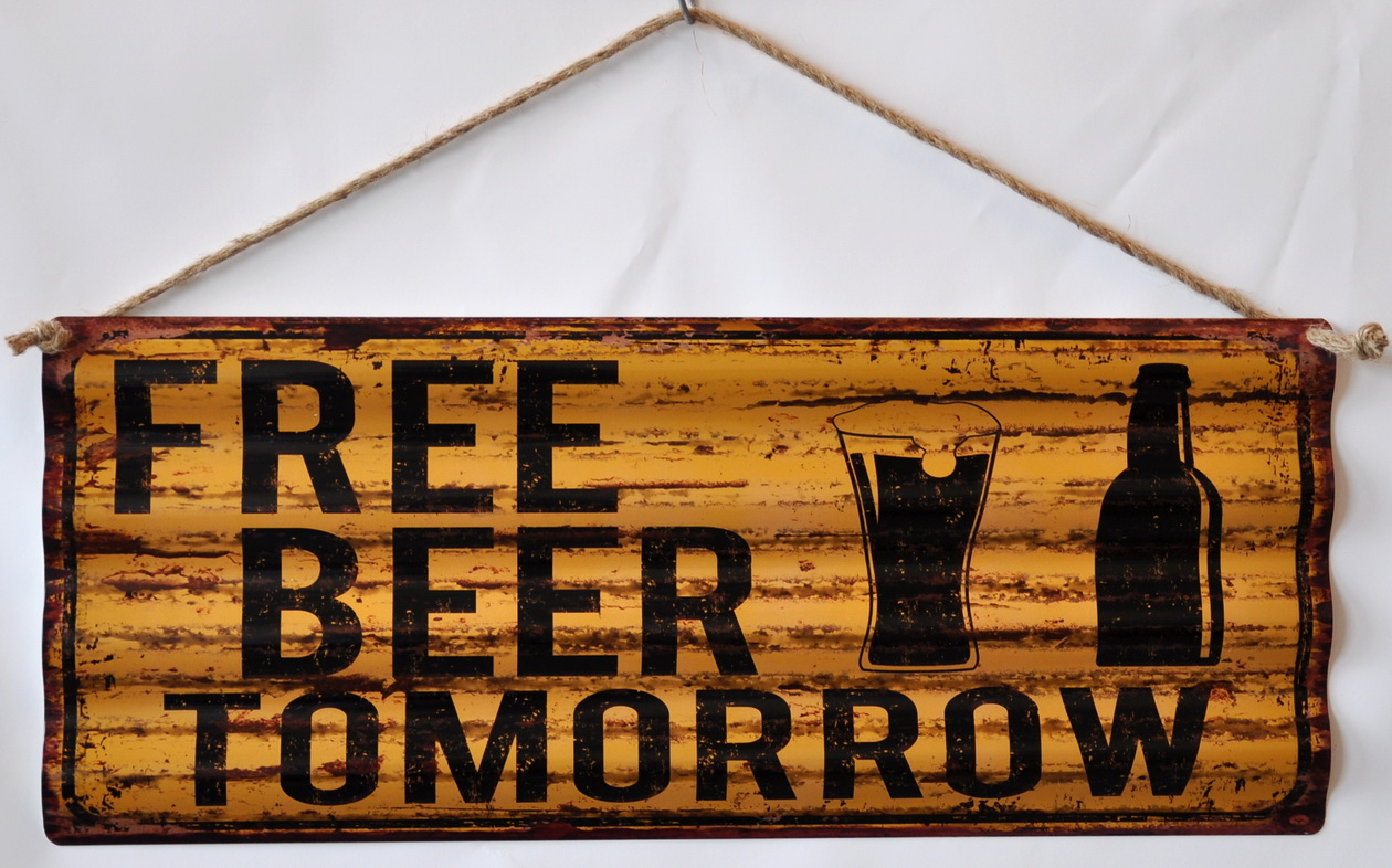 In metallo ondulato, presenta una stampa "FREE BEER TOMORROW" e la sagoma di un boccale di birra. Il metallo presenta un effetto anticato per renderla più in stile vintage industrial.
