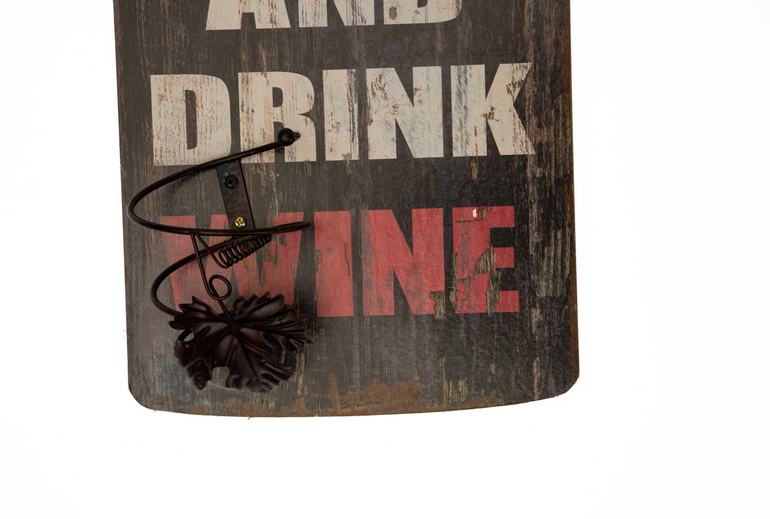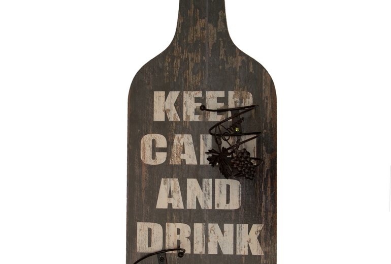 In compensato di legno, presenta una stampa KEEP CALM AND DRINK WINE e è la forma è quella di una bottiglia di vino. Il legno presenta un effetto anticato per renderla più in stile vintage industrial.