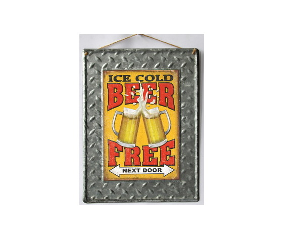 In metallo grigio e giallo, quest'insegna reca una stampa con scritto "Ice Cold Beer Free" e due boccali di birra.