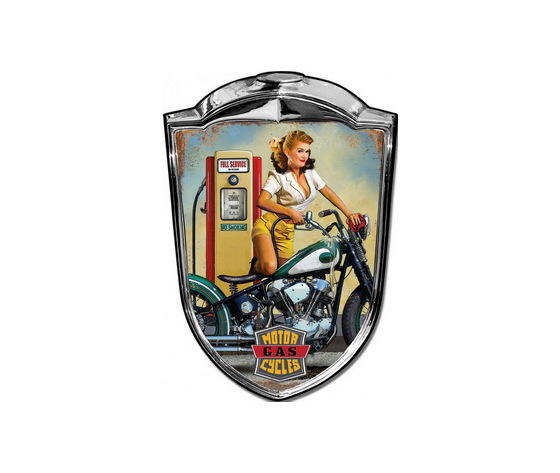 In metallo, presenta una stampa raffigurante l'immagine di una pin-up intenta a far benzina alla propria moto. Il metallo presenta un effetto anticato per renderla più in stile vintage industrial.