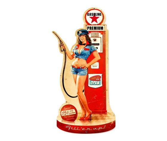 In metallo rappresenta nella stampa e nella forma una Pin-Up intenta a far benzina. Il metallo presenta un effetto anticato per renderla più in stile vintage industrial.