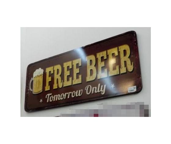 In metallo rettangolare, presenta la scritta FREE BEER - TOMORROW ONLY in giallo su uno sfondo marrone. Il metallo presenta un effetto anticato per renderla più in stile vintage industrial.