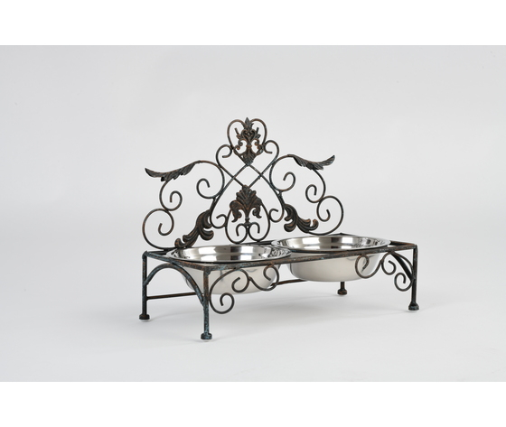 Struttura in ferro battuto, le 2 ciotole in acciaio inox sono facilmente rimuovibili per essere lavate.