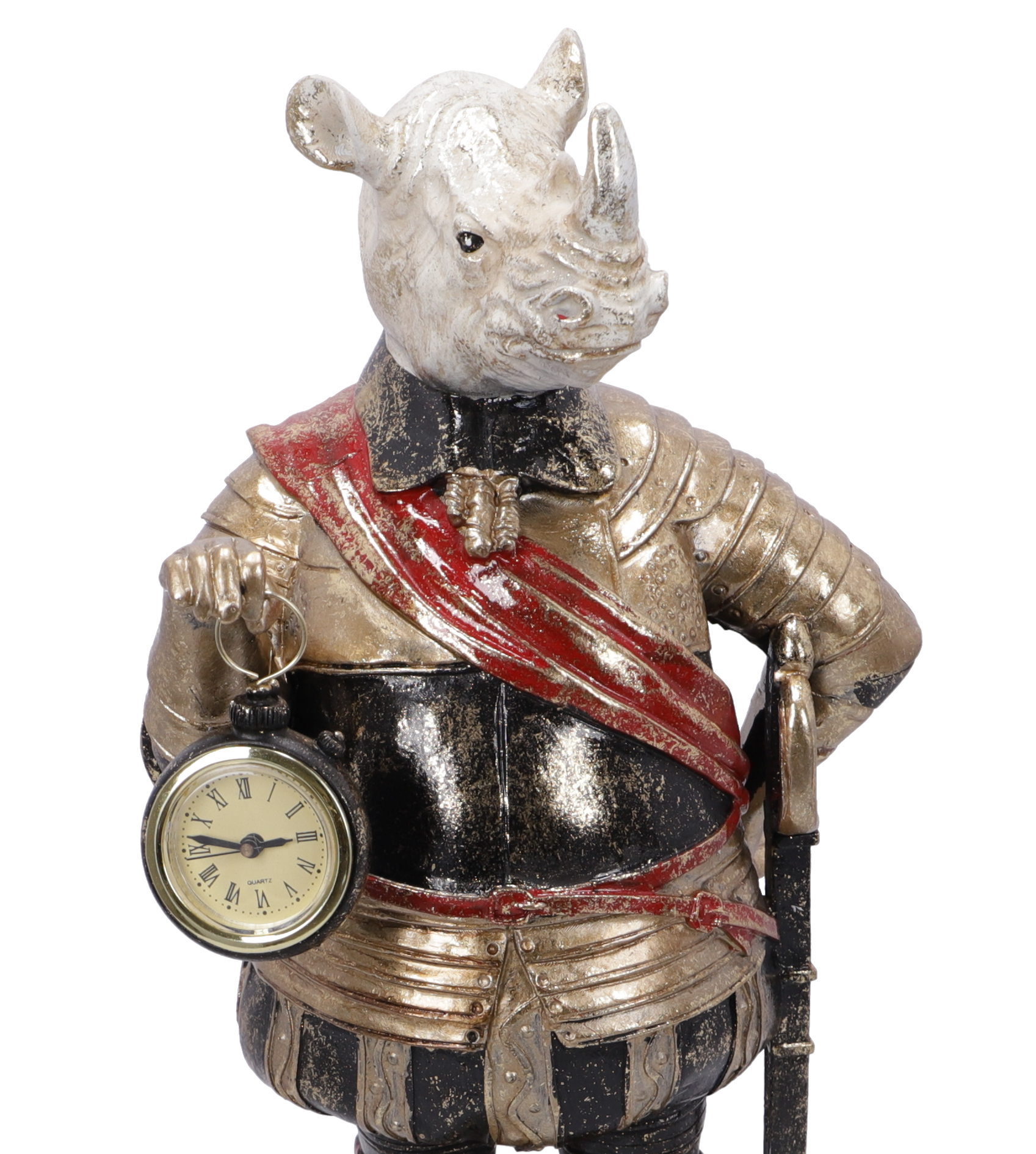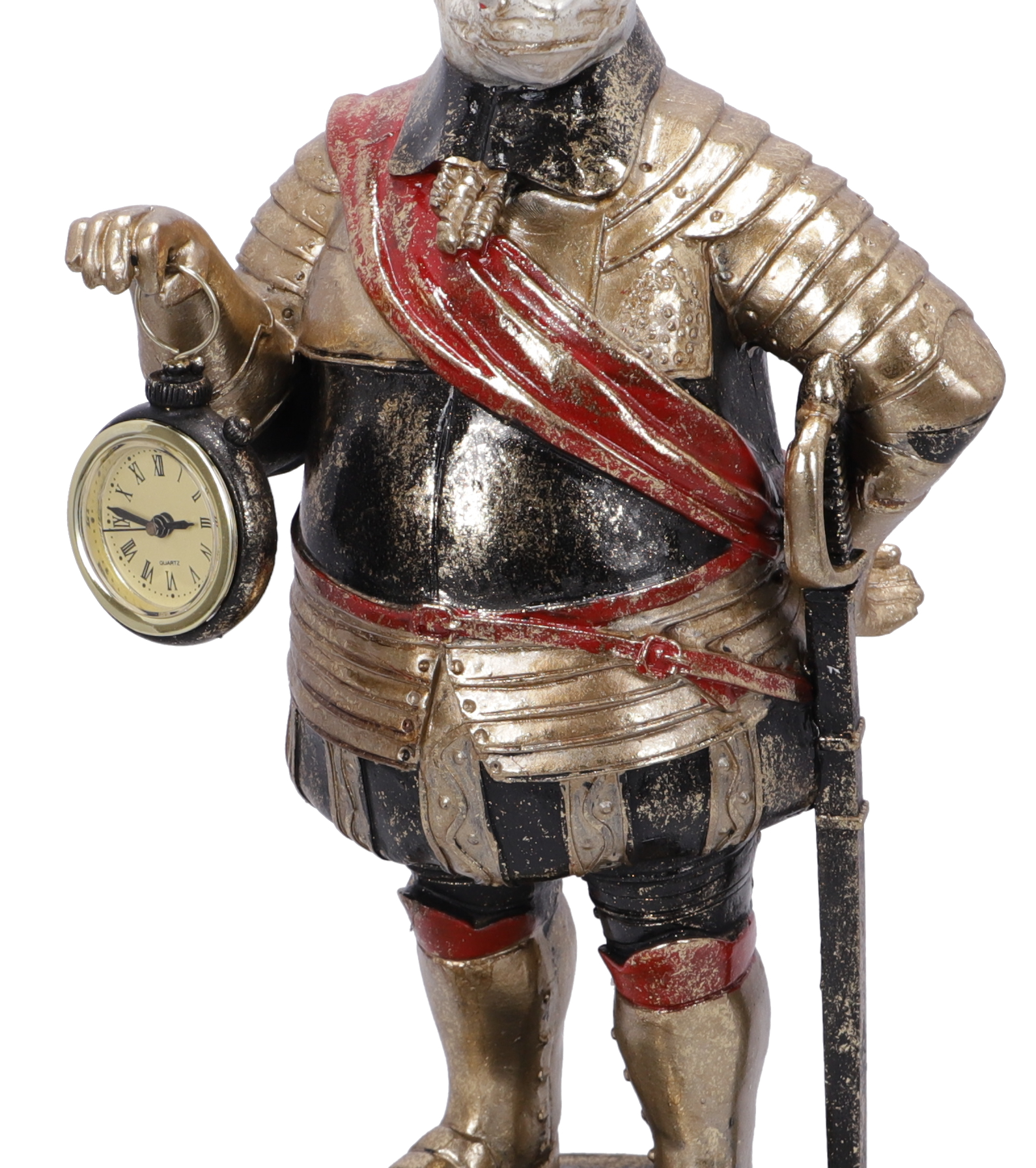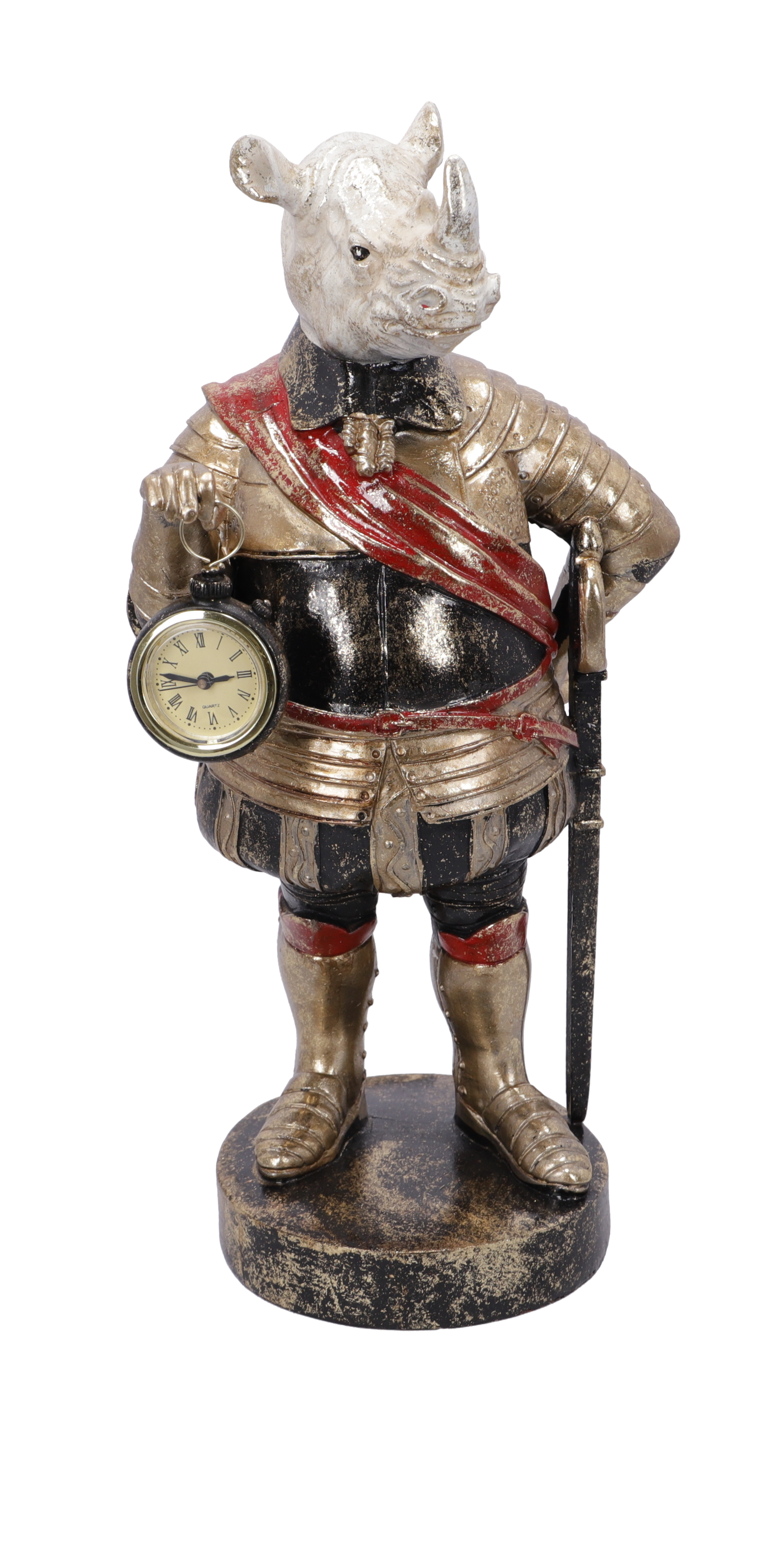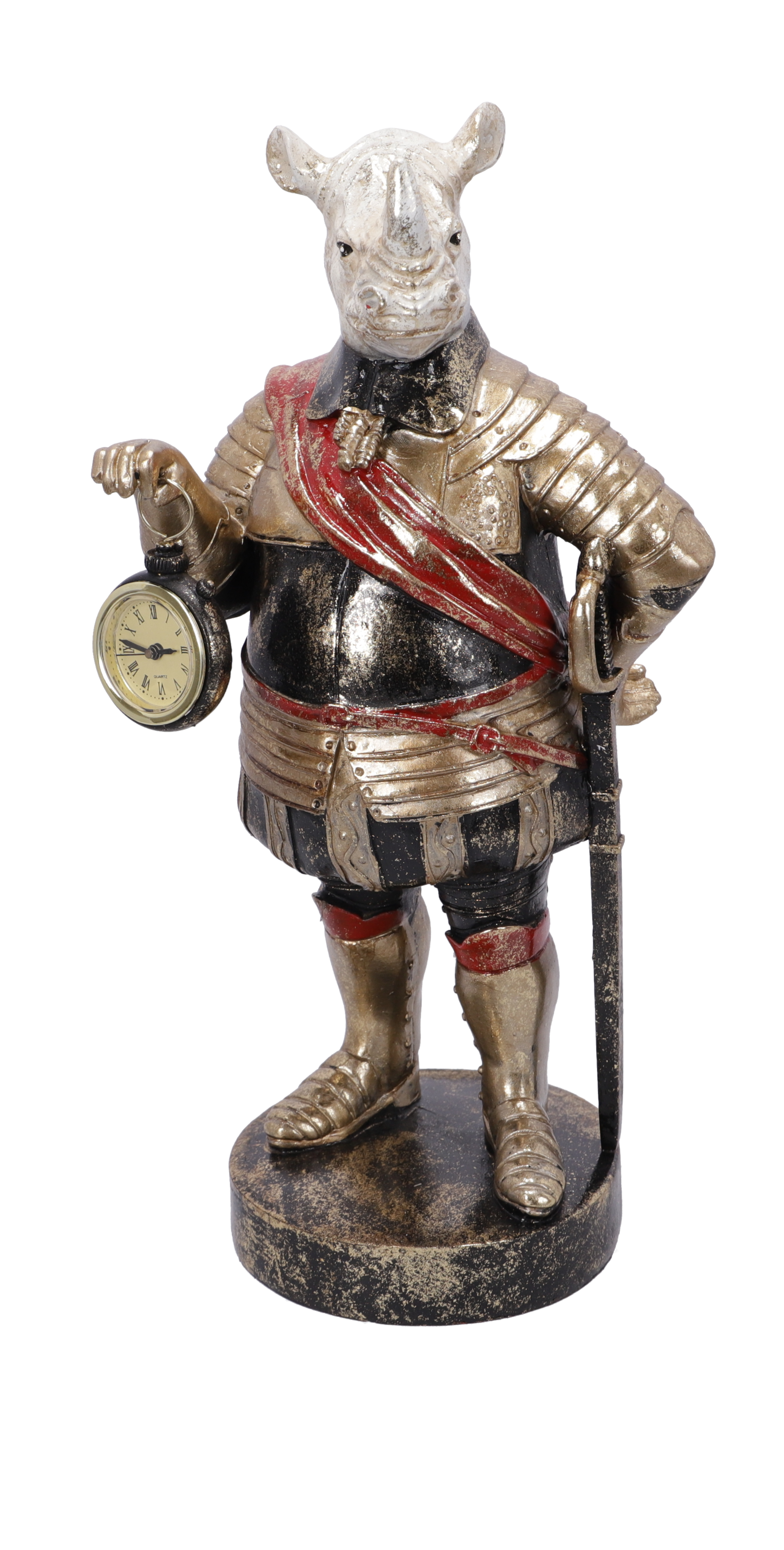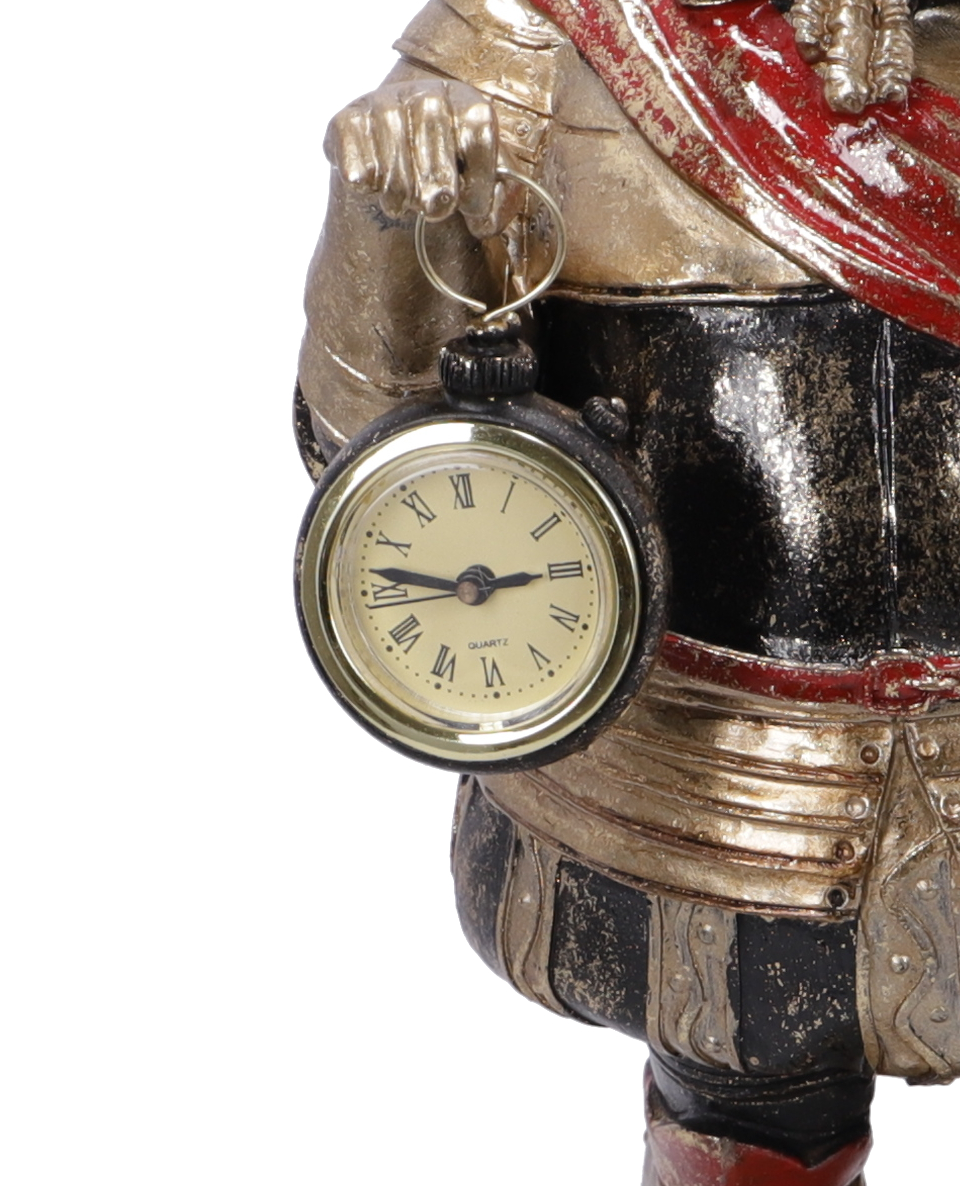 Statuetta in resina con orologio da appoggio decorativo.