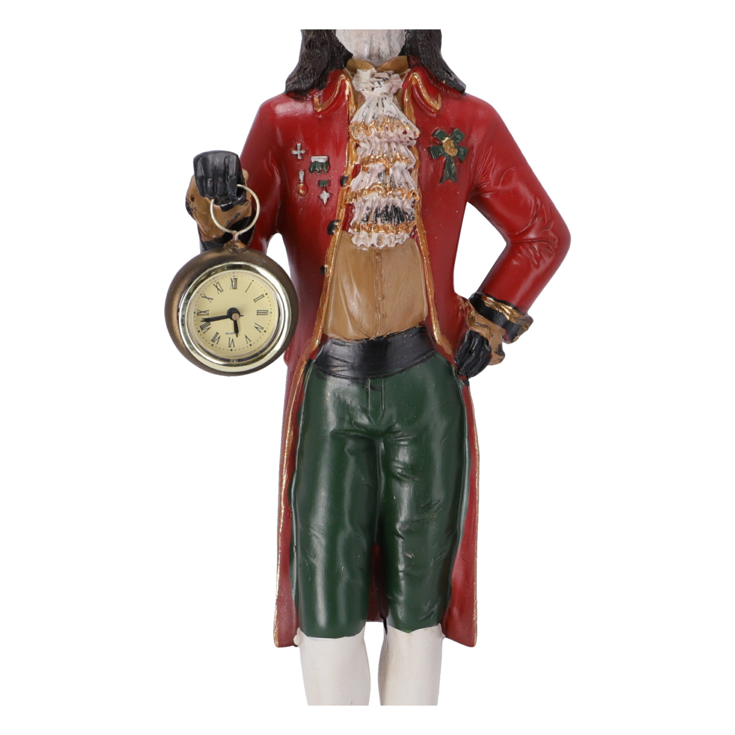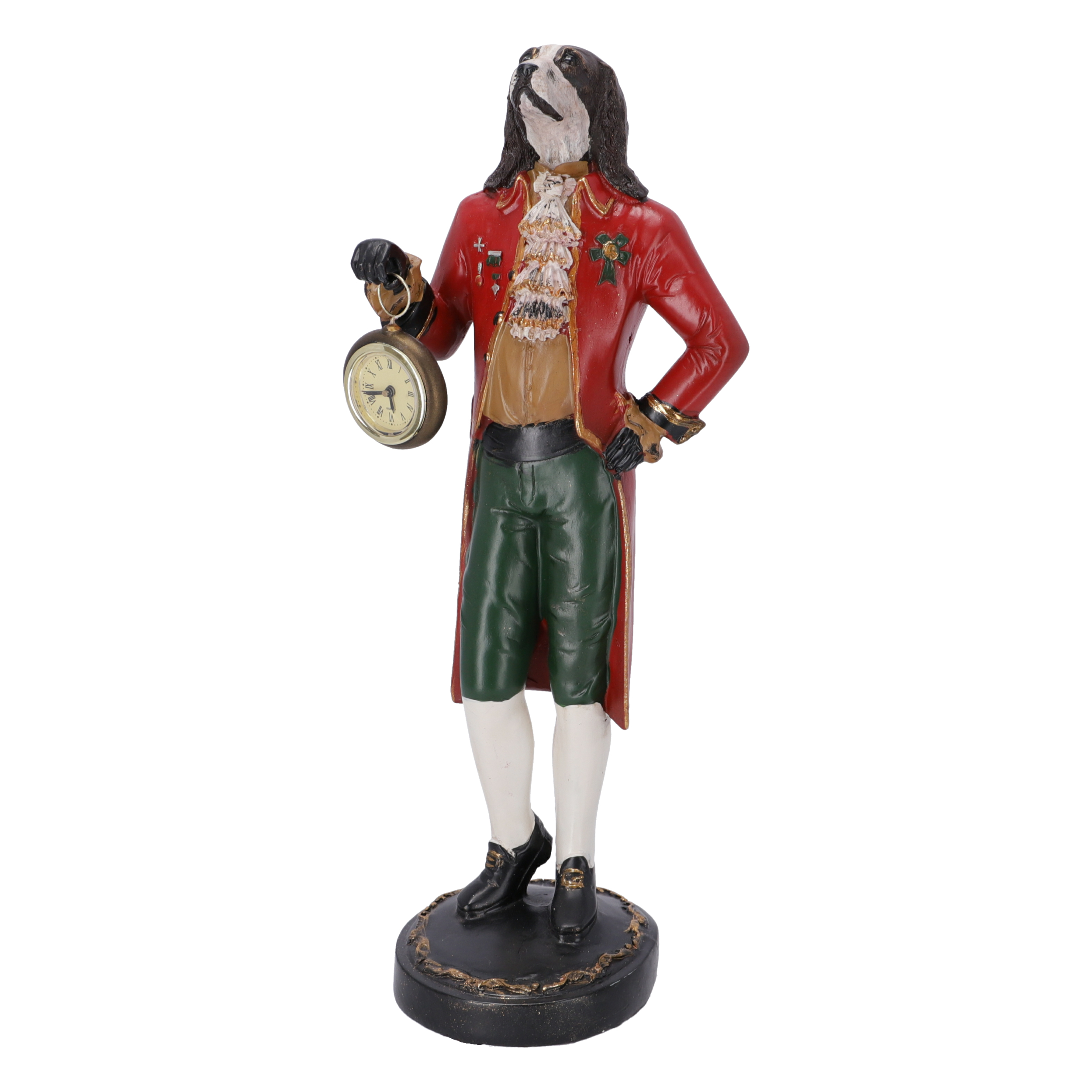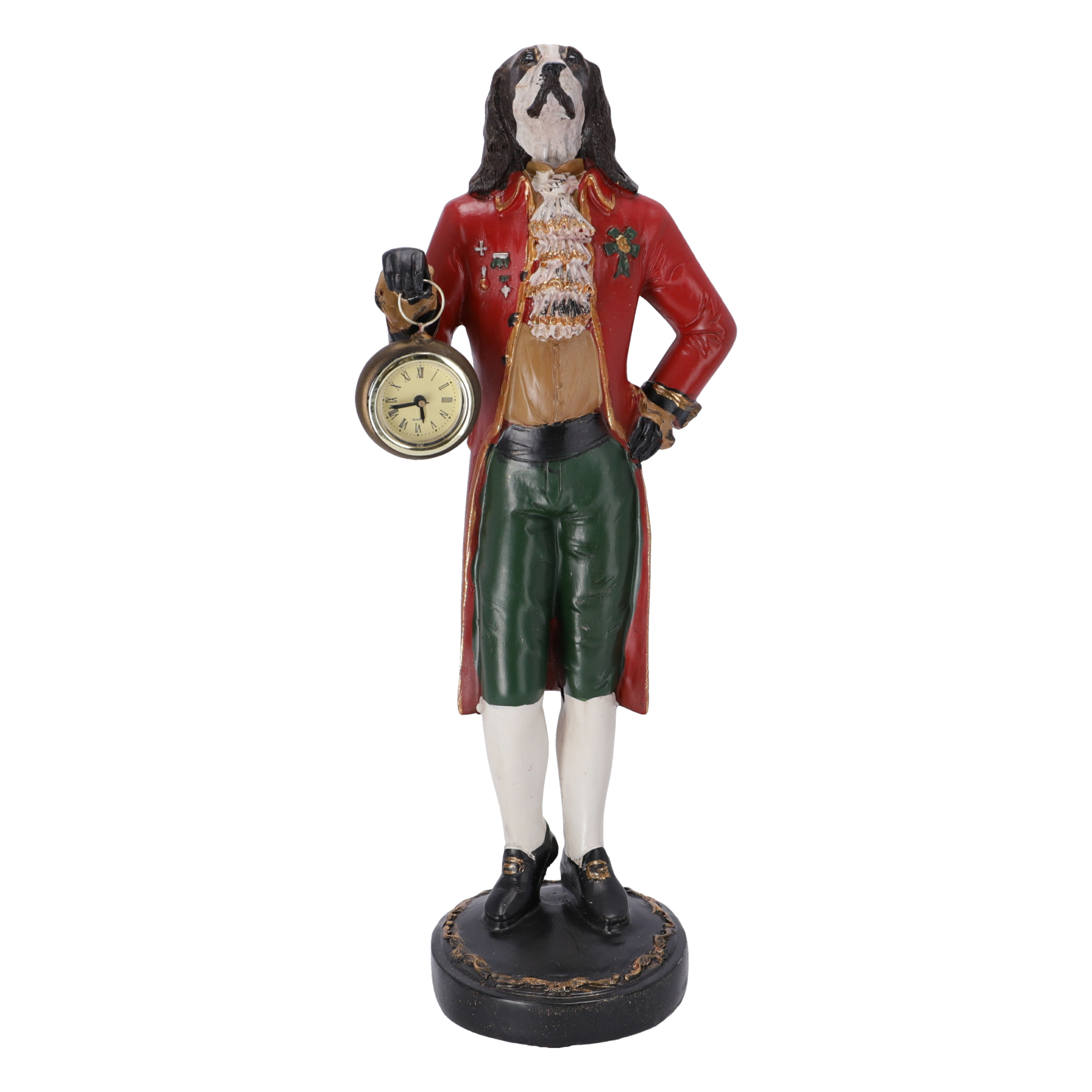 Statuetta in resina con orologio da appoggio decorativo.