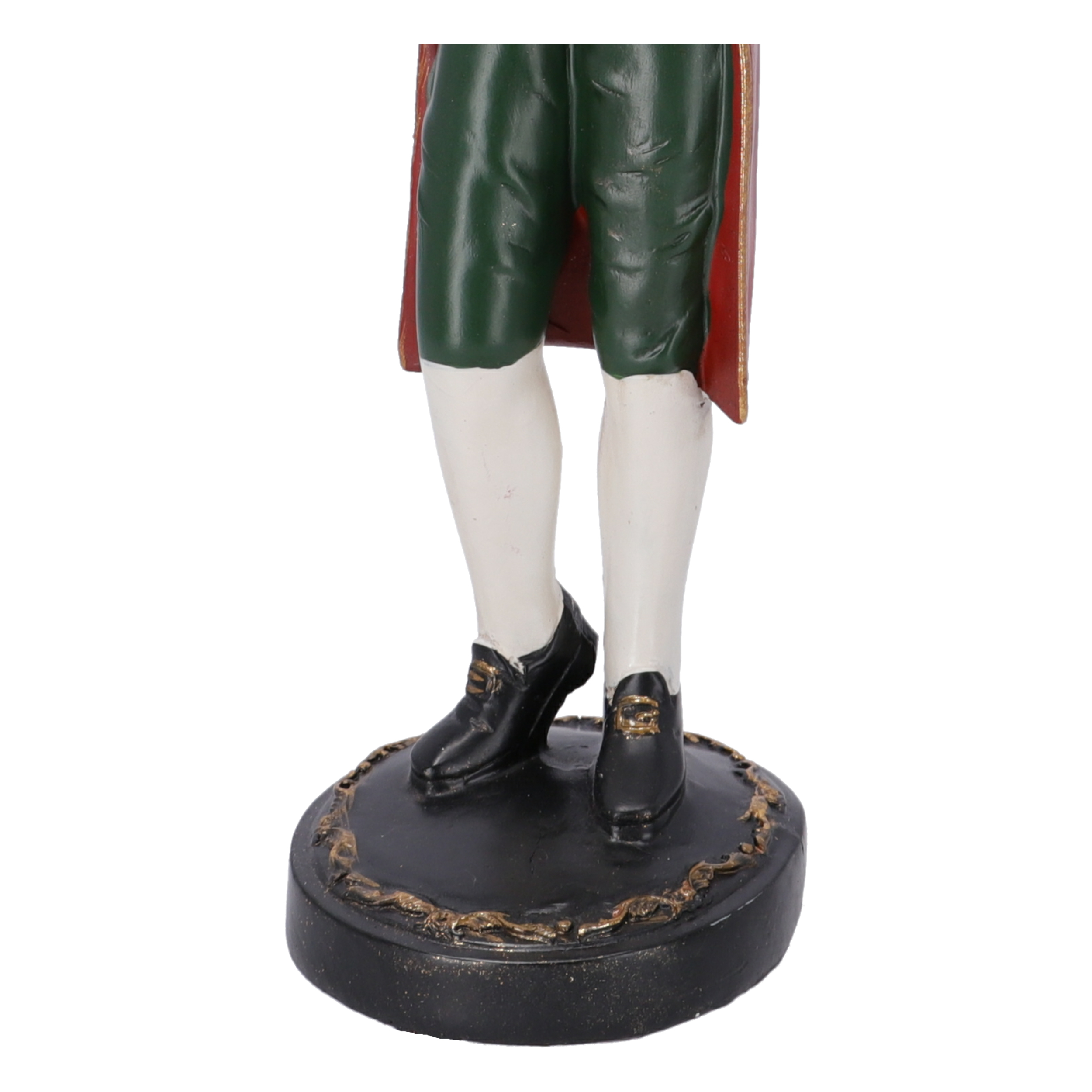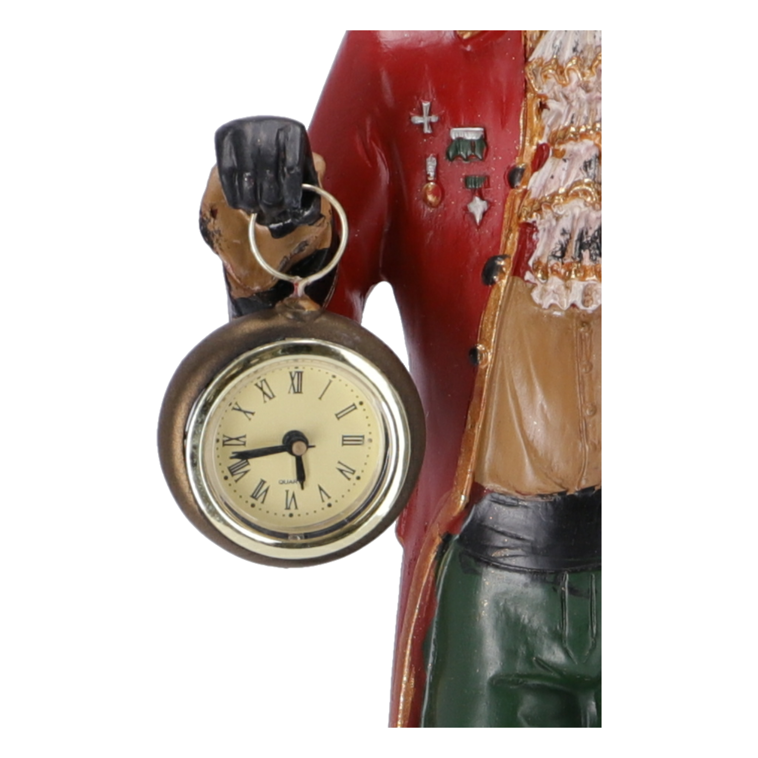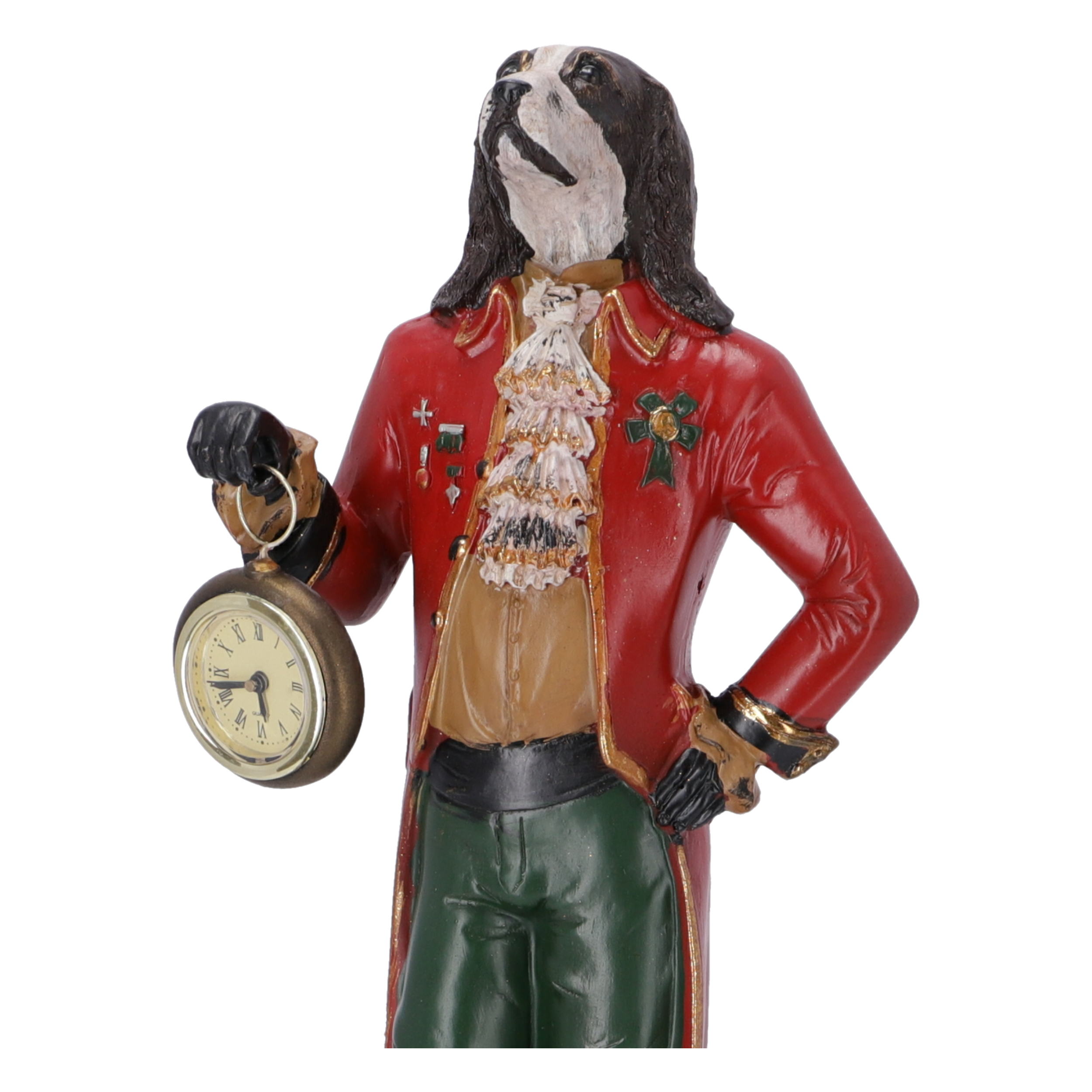 Statuetta in resina con orologio da appoggio decorativo.