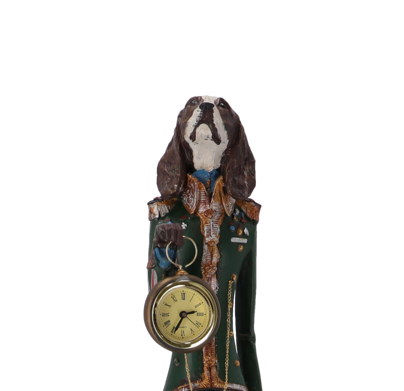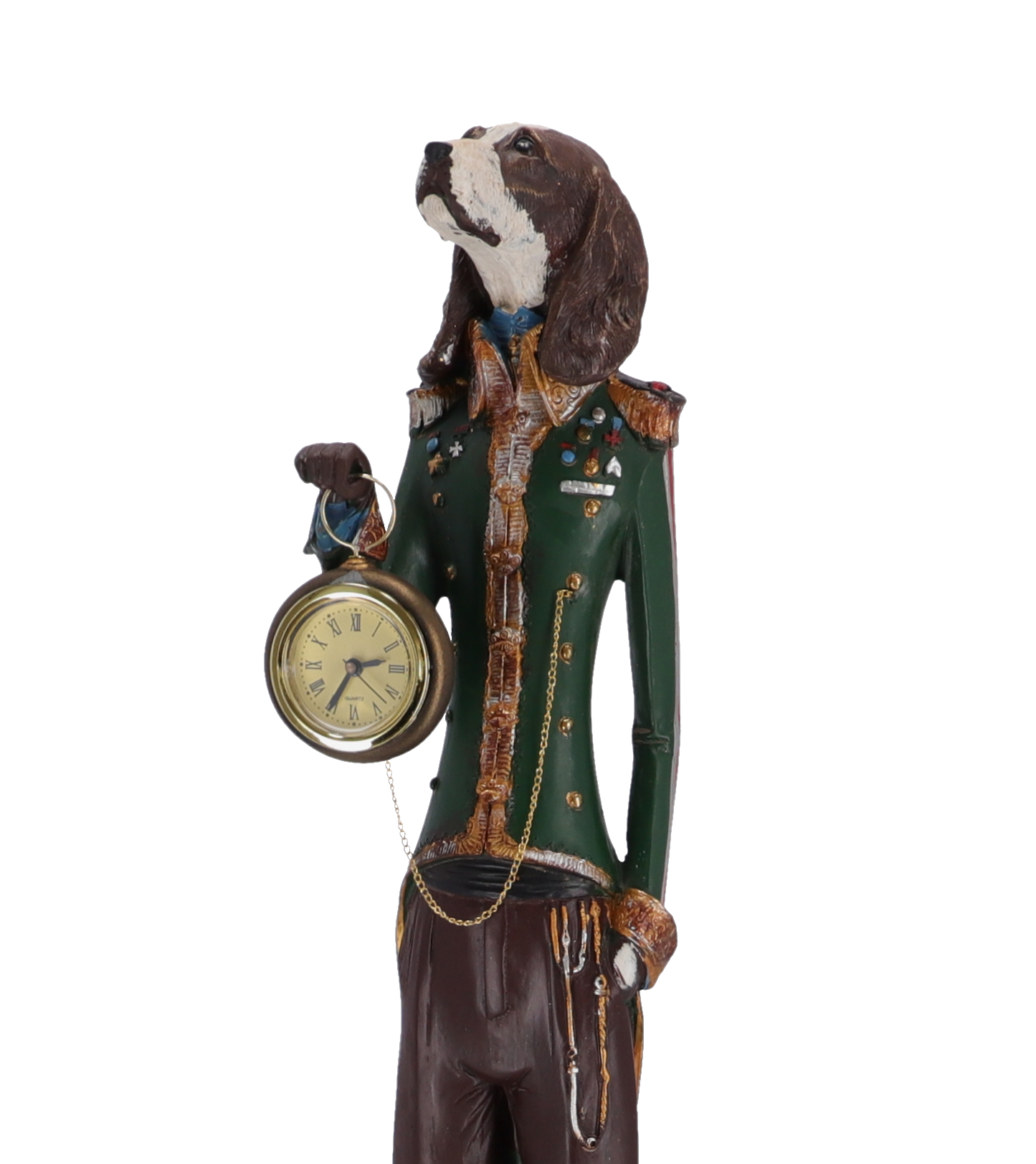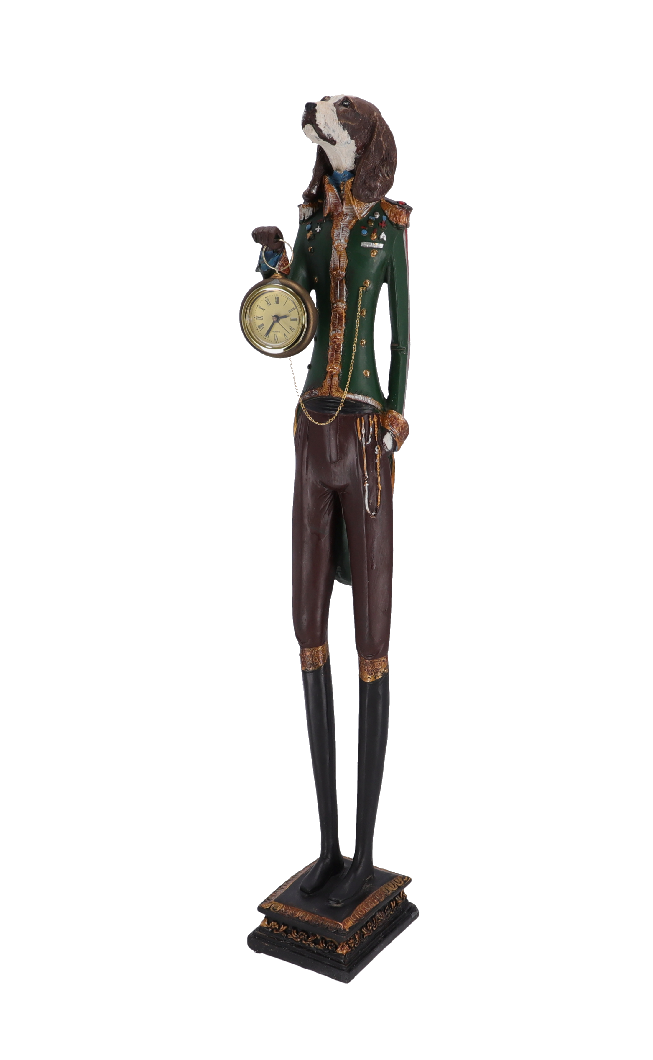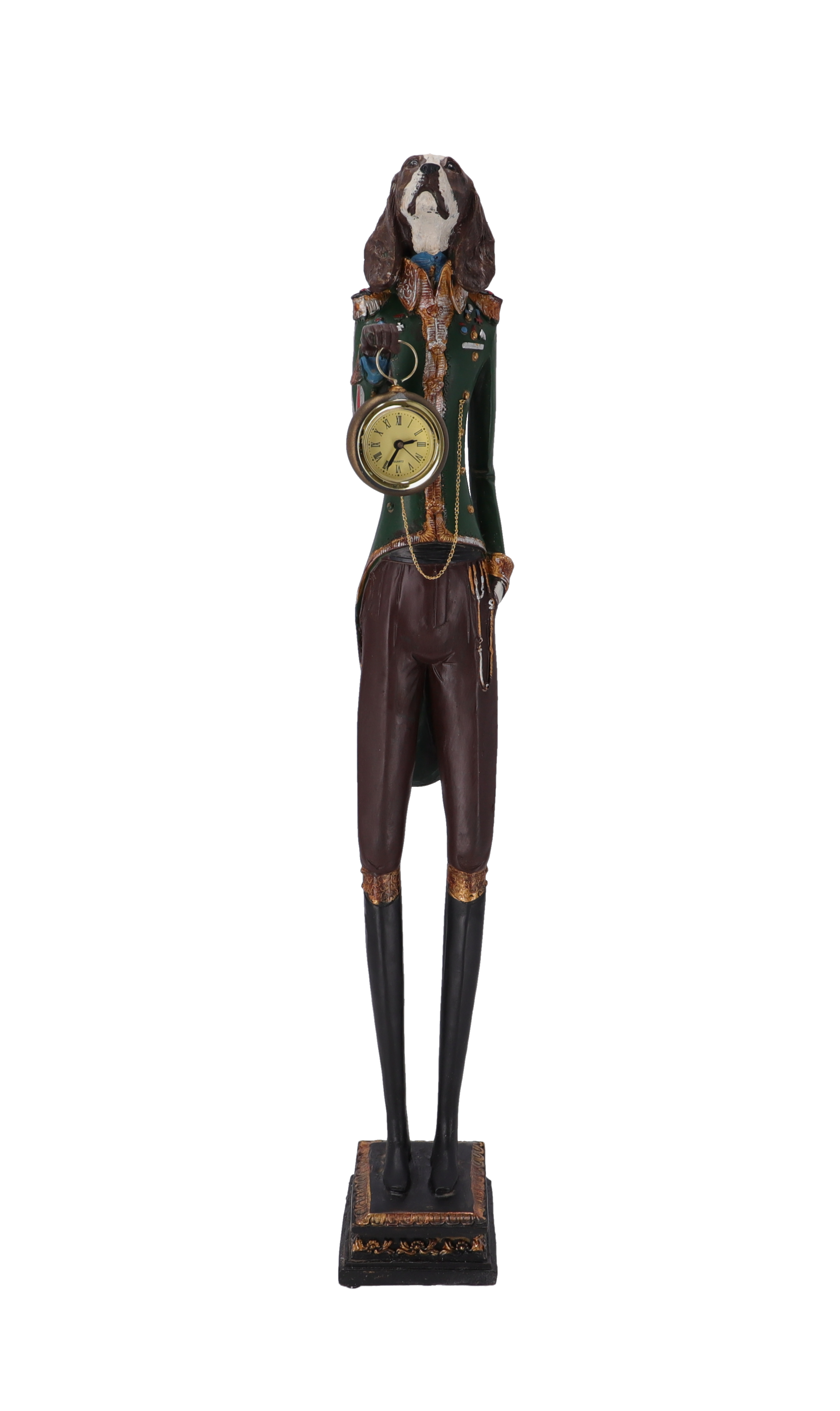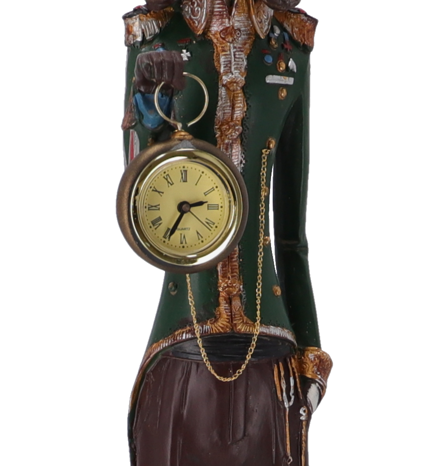 Statuetta in resina con orologio da appoggio decorativo.
